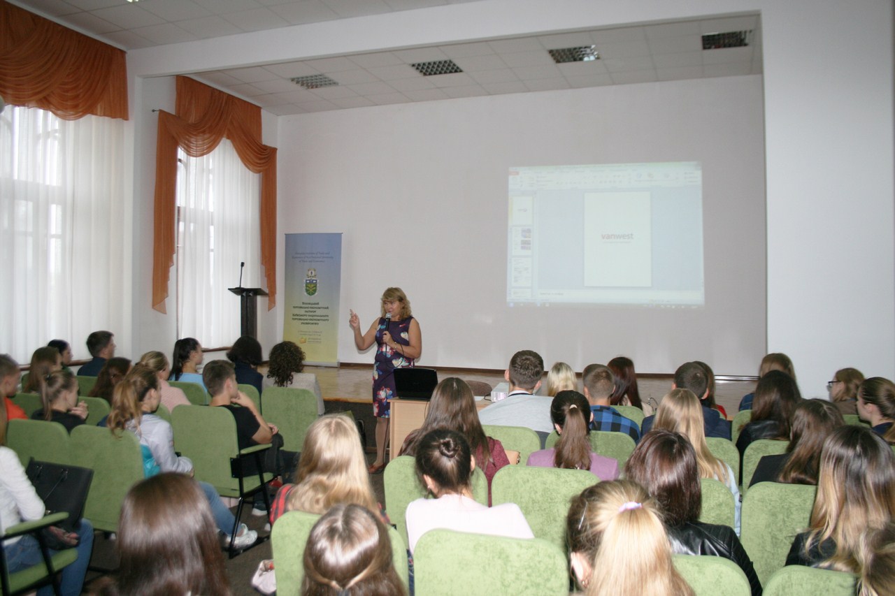 Пані Ірина Кобець розповіла студентам про загальні тенденції освіти в Канаді, про різницю й переваги навчання в коледжах та університетах, а також про можливості подальшого паралельного навчання за дистанційними програмами в Vanwest College (Ванкувер, Канада).
