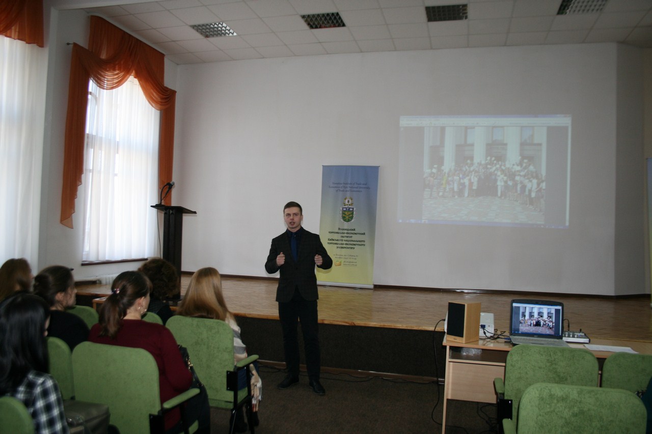 На презентації також був присутній Дмитро Мельник - випускник Вінницького торговельно-економічного інституту КНТЕУ (2012 р.), який успішно пройшов стажування в Апараті Верховної Ради України та зараз працює помічником-консультантом народного депутата України. Студенти ВТЕІ КНТЕУ мали змогу «з перших уст» почути як проходить стажування, які дає можливості та перспективи у подальшому житті.
