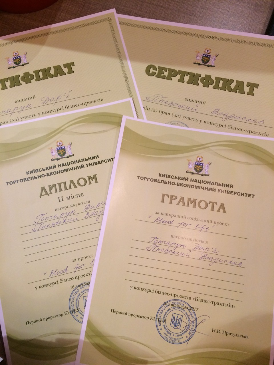16 листопада 2017 року студенти факультету торгівлі, маркетингу та сфери обслуговування Гончарук Дар’я та Пневський Владислав (гр. МР-31 д) здобули призове місце у фіналі конкурсу бізнес-проектів «Бізнес-трамплін», що проходив на базі КНТЕУ. За результатами відбіркового етапу конкурсу до участі у фіналі було допущено авторів десяти бізнес-проектів, які представляли КНТЕУ та інші ВНЗ України. За підсумками презентації та захисту проекту «Blood for life» журі конкурсу у складі фахівців бізнесу та викладачів КНТЕУ нагородило Гончарук Д. та Пневського В. Дипломом за зайняте ІІ місце та Грамотою за найкращий соціальний проект. Вітаємо переможців та бажаємо наступних успіхів!