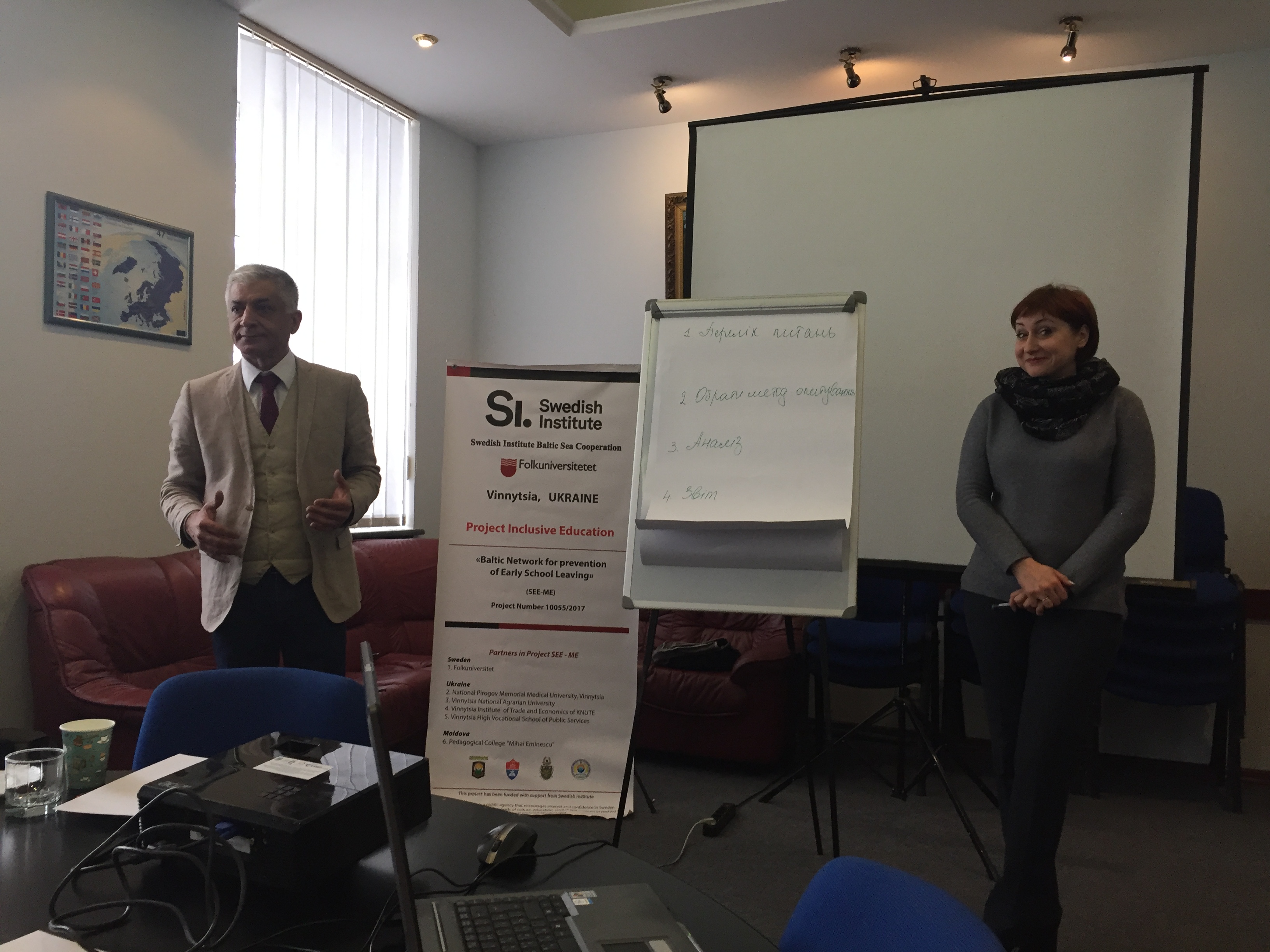 22 січня 2018 року викладачі кафедри менеджменту та адміністрування ВТЕІ КНТЕУ Махначова Н.М., Іванченко Г.В. та Семенюк І.Ю. підвищували свою педагогічну майстерність у черговому тренінгу для викладачів з проблемно-орієнтованого навчання, що проходить у Вінниці за фінансування Швецького Інституту в рамках реалізації міжнародного проекту «Baltic Network for prevention of Early School Leaving» (SEE-ME), Project Number 10055/2017.
