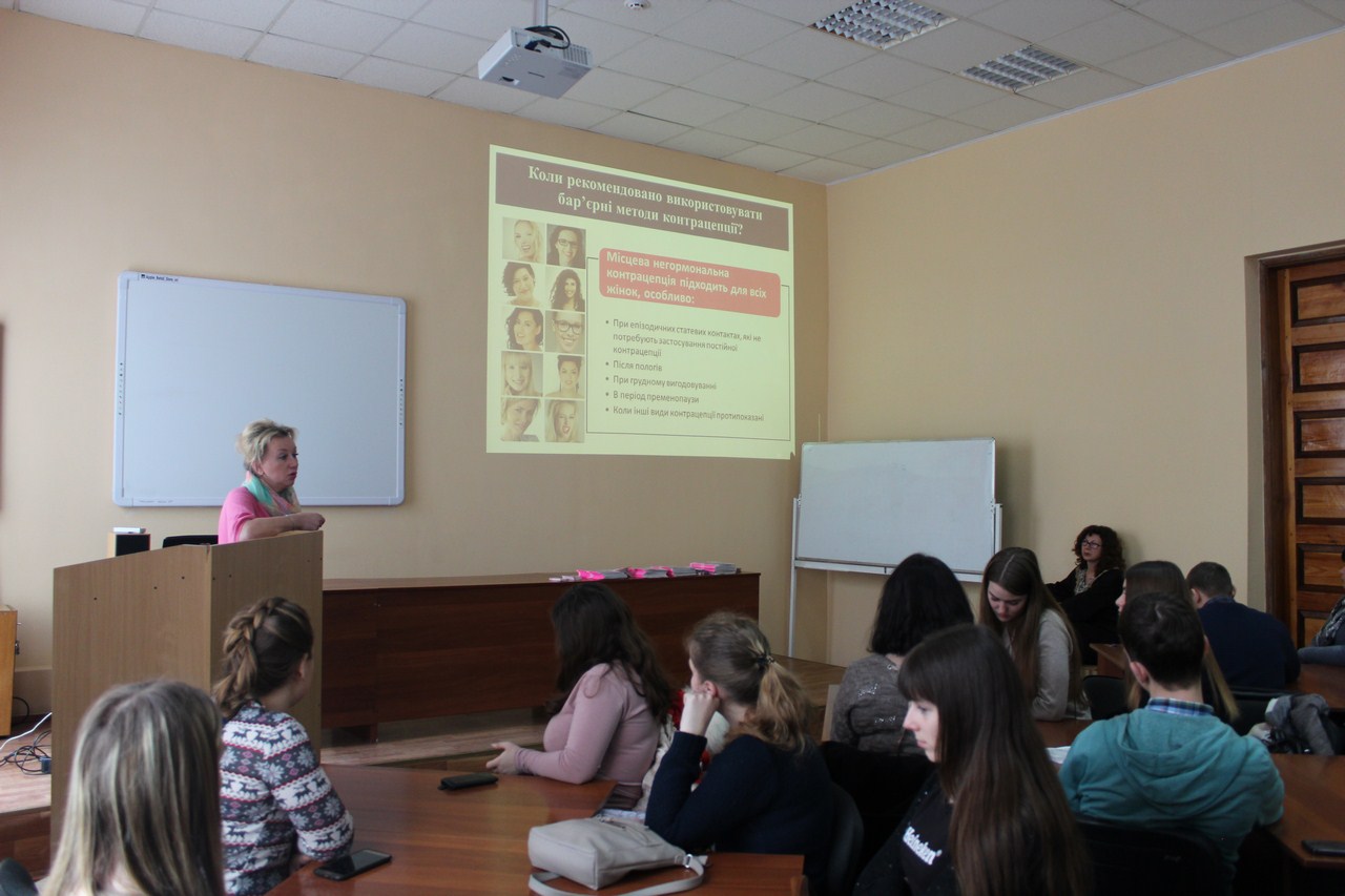 29 березня для студентів перших курсів була проведена зустріч з лікарем вищої категорії Центру планування сім’ї, репродукції людини і медико-генетичного консультування лікарем акушером-гінекологом Оксаною Богданівною Ластовецькою, темою якої була «Репродуктивне здоров’я: його значення та збереження». Оксана Богданівна розповіла про сучасні засоби контрацепції та важливість їх застосування, й продемонструвала презентацію про репродуктивне здоров’я та контрацепцію, розповіла про інфекції, які передаються статевим шляхом, симптоми хвороб та засоби попередження їх виникнення. Зустріч була цікавою та пізнавальною. Студентам роздано роздатковий матеріал, який містить важливу та актуальну інформацію.