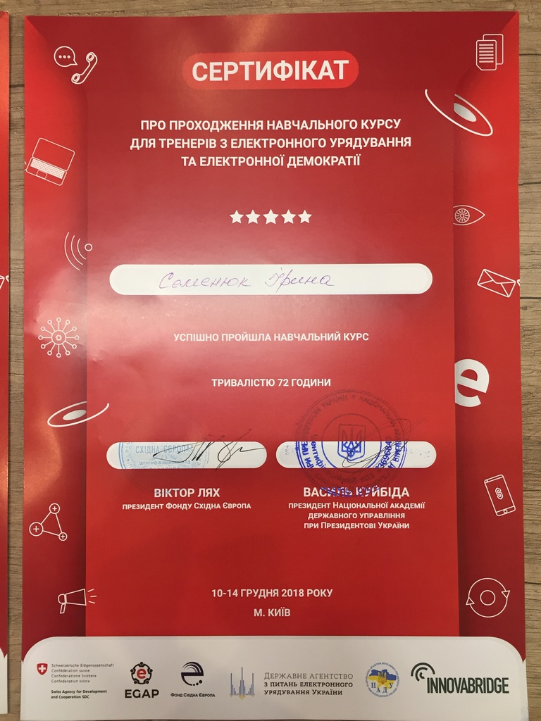 З 10 по 14 грудня 2018 року, в рамках освітнього компоненту Швейцарсько-українська Програми EGAP було проведено тренінг для тренерів з е-урядування та е-демократії, де взяли участь представники кафедри менеджменту та адміністрування доцент Махначова Н.М. та старший викладач Семенюк І.Ю.