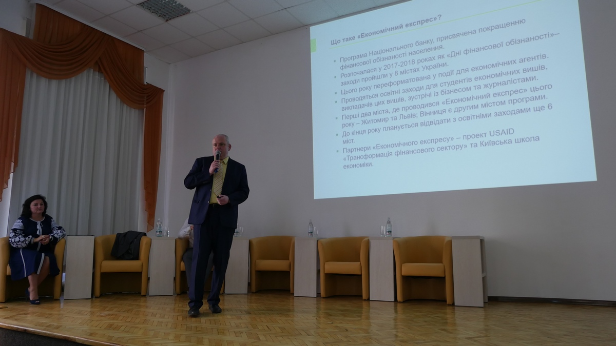 Зі вступним словом виступив керівник проектів та програм департаменту комунікацій НБУ Леонід Зябрев, котрий ознайомив присутніх з метою проведення освітнього лекторію, який проходить в рамках програми «Економічний експрес».