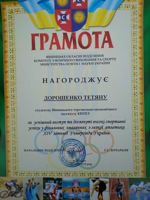 Переможців та призерів ХІV літньої Універсіади України нагороджено грамотами та подяками: Дорошенко Тетяну, Коменчук Олега – грамота за успішний виступ та високі спортивні успіхи у фінальних змаганнях з легкої атлетики.