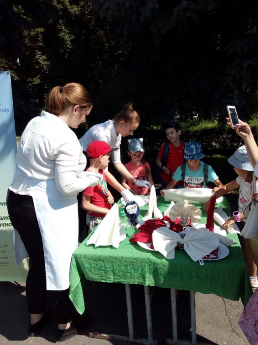 11 червня 2019 року здобувачі вищої освіти спеціальності «Готельно-ресторанна справа» Симоненко А.О. та Галицька І.В. на чолі з асистентом кафедри туризму та готельно-ресторанної справи Пахомською О. В. взяли участь у профорієнтаційному заході «Подорож у світ професій», організованому Вінницьким міським центром зайнятості для учнів 1-7 класів, учасників літніх пришкільних таборів міста. Студенти продемонстрували усім охочим зразки сервірування банкетного столу, провели майстер-клас по складанню серветок. Учні з радістю долучилися до заходу, завзято ставили питання щодо сервірування столу, підбору столових приборів та скляного посуду.
