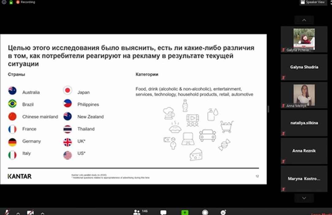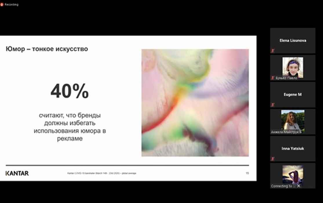 27 квітня 2020 року викладачі ВТЕІ КНТЕУ та здобувачі вищої освіти ОП «Міжнародний бізнес» ОС «бакалавр», ОП «Маркетинг» ОС «молодший бакалавр», «бакалавр», «магістр», ОП «Публічне управління та адміністрування» ОС «бакалавр» прийняли участь у воркшопі «Відношення споживачів до реклами в часи COVID-19 в світі» – від провідної у світі дослідницької компанії – «Kantar Україна».