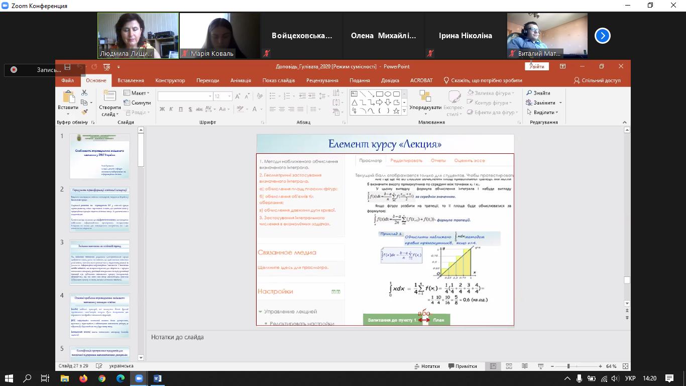 У ході семінару обговорювались актуальні в наш час питання використання різноманітних освітніх середовищ в умовах дистанційного навчання, порівняння їх можливостей, а також особливості впровадження змішаного навчання при викладанні дисциплін «Вища та прикладна математика», «Теорія ймовірностей та математична статистика», «Технології бізнес-аналітики» тощо.