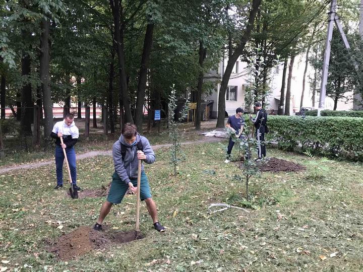 Студенти факультету економіки, менеджменту та права ВТЕІ КНТЕУ Владислав Ксенченко, В’ячеслав Апостол, Максим Грубий, як волонтери допомогли підготувати місце для молодих дерев.