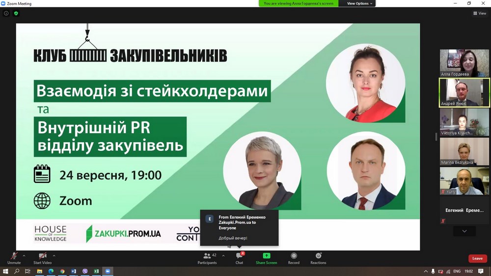 24 вересня 2020 року викладачі та здобувачі вищої освіти Вінницького торговельно-економічного інституту КНТЕУ брали участь у засіданні Клубу Закупівельників, яке було присвячене надважливій темі: «Взаємодія зі стейкхолдерами та внутрішній PR відділу закупівель».