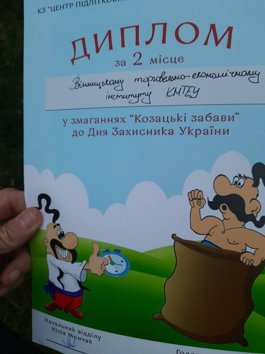 13 жовтня 2020 року збірна команда ВТЕІ КНТЕУ у складі Келіпа Миколи (ФБСС-11), Дрогалігої Вікторії (ПР-32), Бондарчука Даниіла (ГРС-21), Мазур Діани (МР-11мб), Дзюби Олександра (ТКЛ-31), Шевчука Максима (ПТБД-21) та Шлапака Івана (ФБСС-11) взяла участь у змаганнях «Козацькі забави», організованому за сприянням Відділу молодіжної політики Вінницької міської ради, Вінницької молодіжної ради та присвяченому Дню Захисника України.