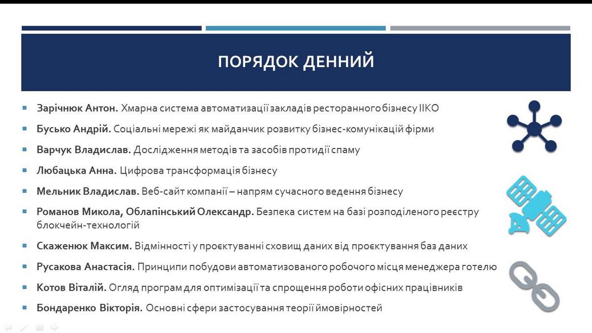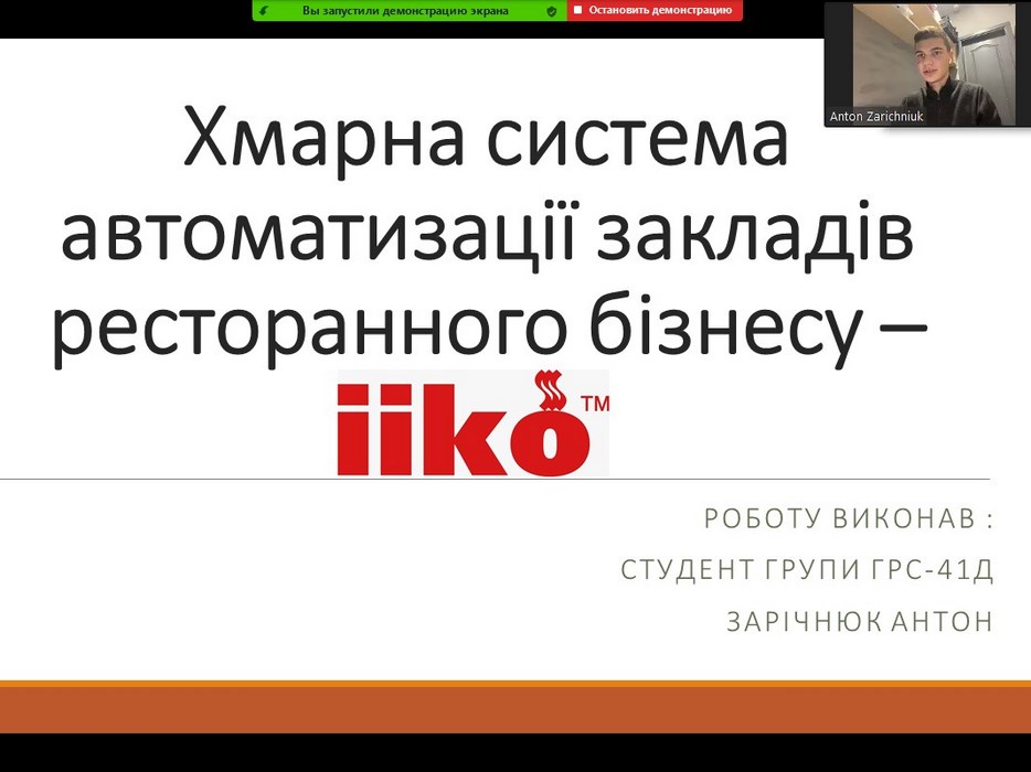 - Зарічнюк Антон, гр. ГРС-41д, доповідь на тему «Хмарна система автоматизації закладів ресторанного бізнесу ІІКО»;