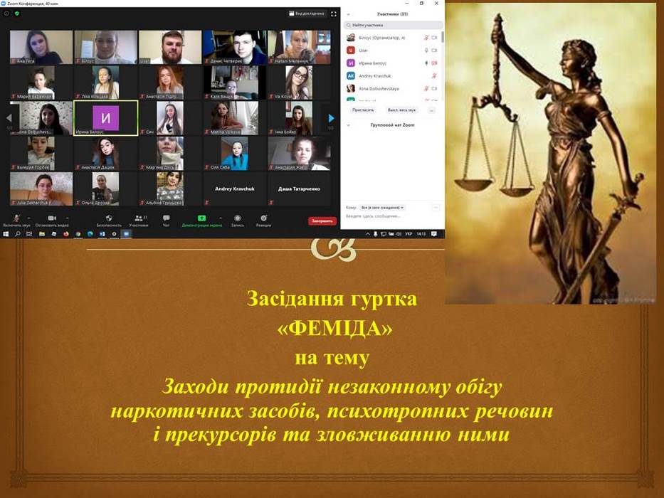 12 листопада 2020 року відбулося онлайн засідання наукового гуртка «Феміда» (керівник к.ю.н., доцент кафедри права Білоус І.М.) на тему «Заходи протидії незаконному обігу наркотичних засобів, психотропних речовин і прекурсорів та зловживанню ними». На засіданні були присутні члени гуртка, а також був гість Олександр Волошин - керівник Міжнародної Антинаркотичної асоціації м. Вінниці (https://www.facebook.com/maavinnitsa).