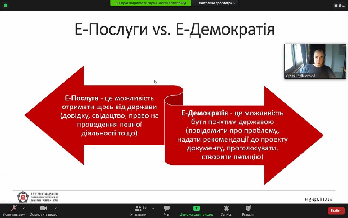 18 листопада 2020 року кафедрою менеджменту та адміністрування спільно з кафедрою економічної кібернетики та інформаційних систем в рамках діяльності наукової студії «Цифрова трансформація в громадах» (керівник – доцент Ніколіна І.І.) для здобувачів спеціальностей «Публічне управління та адміністрування» та «Інформаційні системи та технології» було організовано онлайн-лекцію «Архітектура е-сервісів в Україні. Впровадження електронних державних послуг». Спікером заходу було запрошено координатора компоненту «Е-послуги» Програми «Електронне урядування задля підзвітності влади та участі громади» (Програма EGAP) Олексія Зелів’янського, а модератором виступив Іван Копиченко, регіональний координатор програми EGAP в Одеській області.