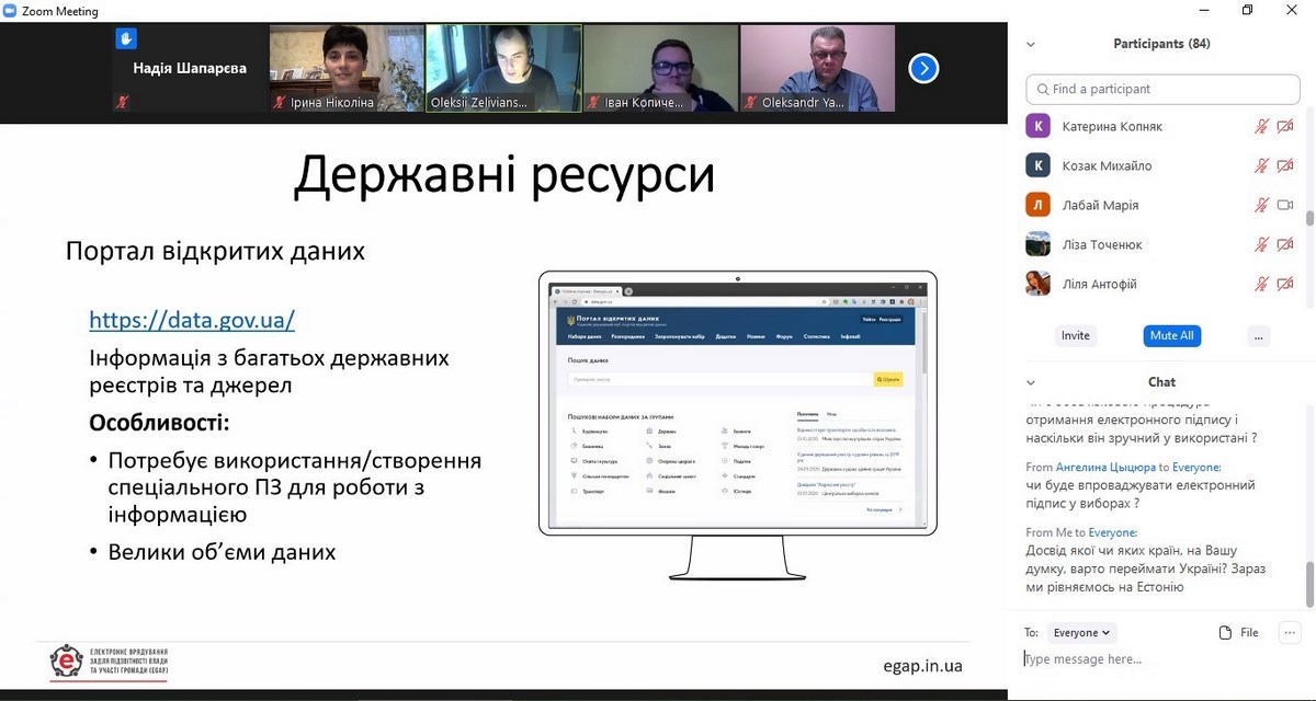 Одним із ключових напрямів Програми EGAP є впровадження зручних, швидких та прозорих державних електронних послуг для громадян і бізнесу. Внаслідок впровадження державних електронних послуг ми отримуємо доступні та якісні адміністративні послуги в режимі онлайн, органи влади – оптимізовані процеси та економію часу, а суспільство загалом – мінімізацію корупційних ризиків та більш ефективне, підзвітне врядування. У ході лекції було розглянуто багато теоретичних та практичних аспектів щодо інфраструктури е-послуг в Україні, їх класифікації, засобів електронної ідентифікації, порядку отримання, накладання та перевірки електронного підпису, процедури надання е-послуги, проведено огляд ресурсів для пошуку інформації та державних порталів е-послуг.