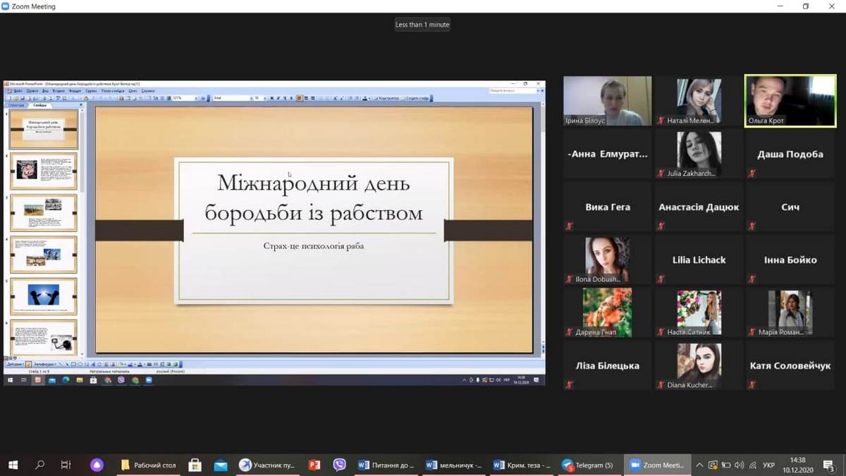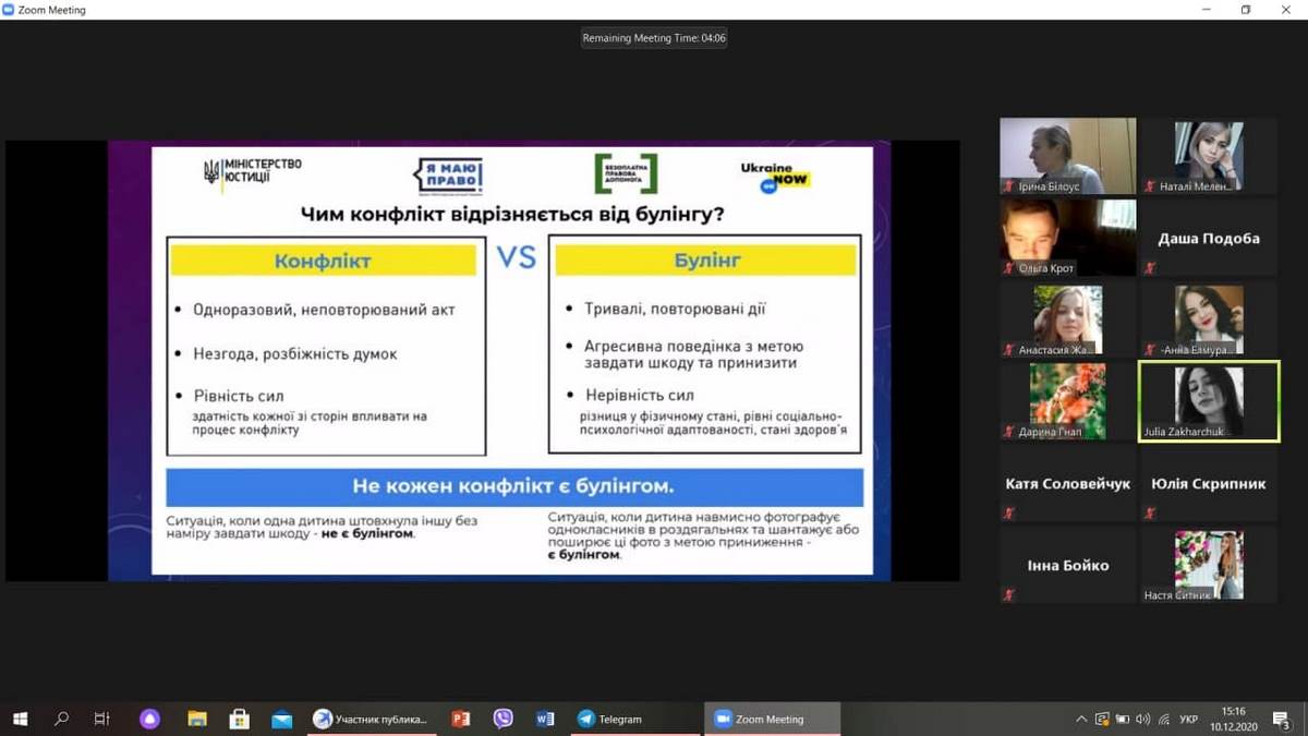 10 грудня 2020 року з нагоди відзначення Міжнародного дня захисту прав людини відбулося засідання наукового гуртка «Феміда» (керівник к.ю.н., доцент кафедри права Білоус І.М.) на тему «Юридичний захист прав людини». Члени гуртка виступили з доповідями та обоговорили актуальні питання на наступні теми: