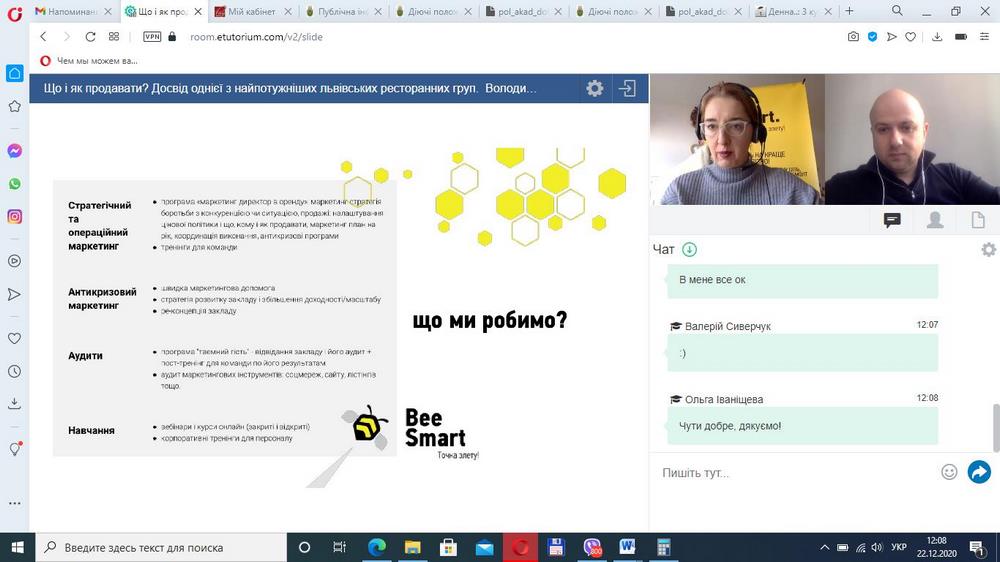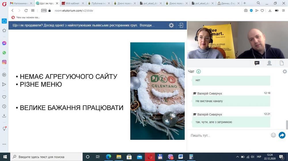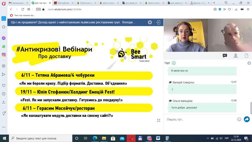22 грудня 2020 року науково-педагогічні працівники кафедри туризму та готельно-ресторанної справи, здобувачі вищої освіти, які навчаються за спеціальностями «Харчові технології», «Готельно-ресторанна справа», взяли участь у вебінарі «Що і як продавати? Досвід однієї з найпотужніших львівських ресторанних груп», який відбувся в рамках міні-курсу «Як правильно запустити доставку?».