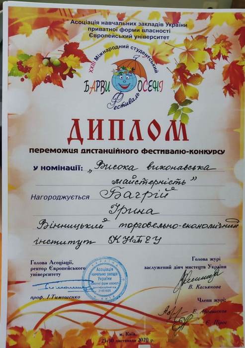 ВТЕІ КНТЕУ брав участь у XХІІІ Міжнародному фестиваль-конкурсі студентської художньої творчості «БАРВИ ОСЕНІ – 2020»