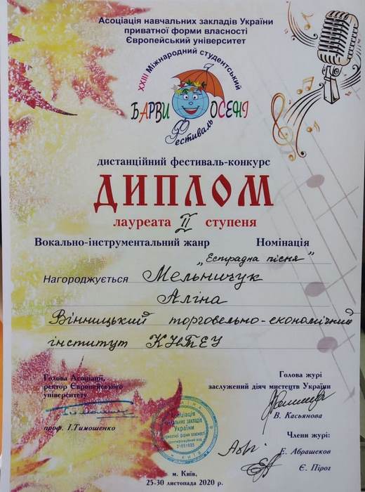- Диплом лауреата 2 ступеня в вокально-інструментальному жанрі у номінації «естрадна пісня» – Аліна Мельничук (художній керівник Адам Дзюба);