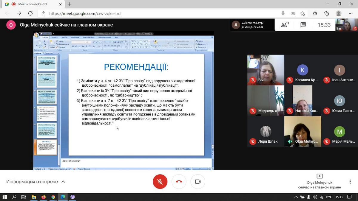 Також учасники вебінару говорили про те, як дотримання доброчесності впливає на якість освіти, про важливість дотримання академічної доброчесності як науково-педагогічним персоналом, так і здобувачами вищої освіти, про необхідність формування культури дотримання академічної доброчесності у Вінницькому торговельно-економічному інституті КНТЕУ.