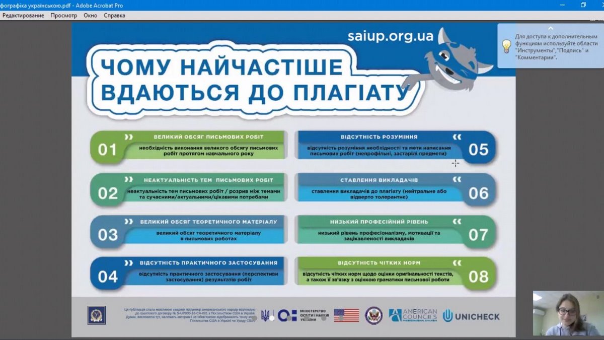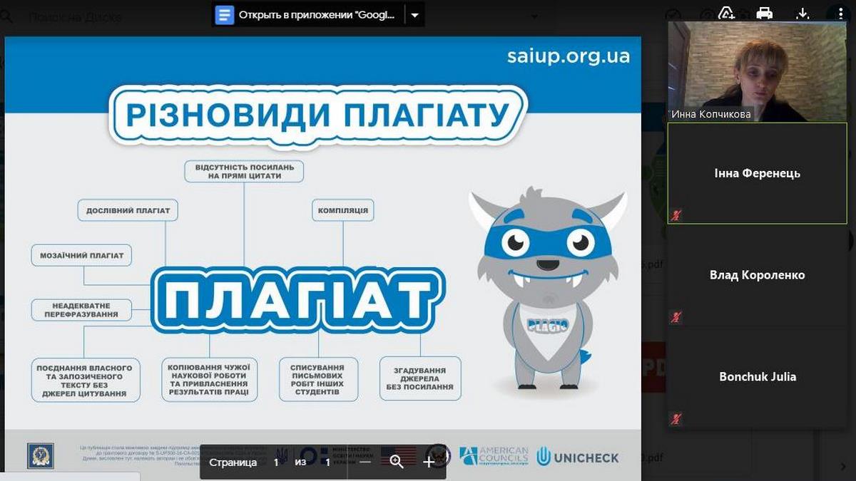 Для підготовки та проведення заходів були використані освітні ресурси сайту https://academiq.org.ua/ та матеріали, які напрацьовані в рамках Проєкту сприяння академічній доброчесності в Україні (Strengthening Academic Integrity in Ukraine Project – SAIUP), а також онлайн версії програм перевірки академічних текстів на вміст плагіату.