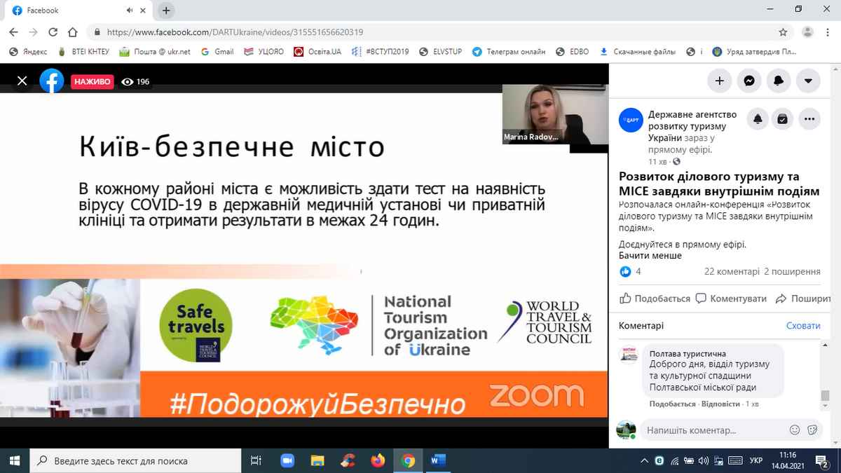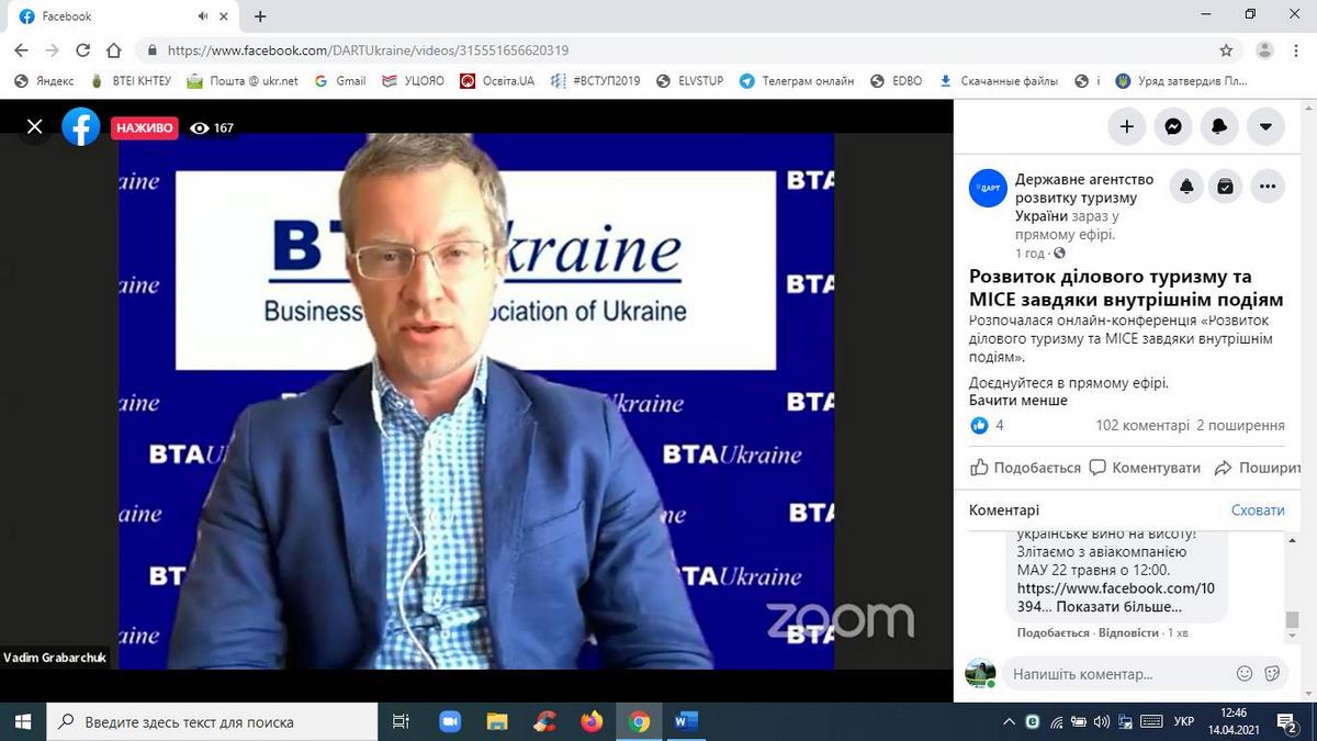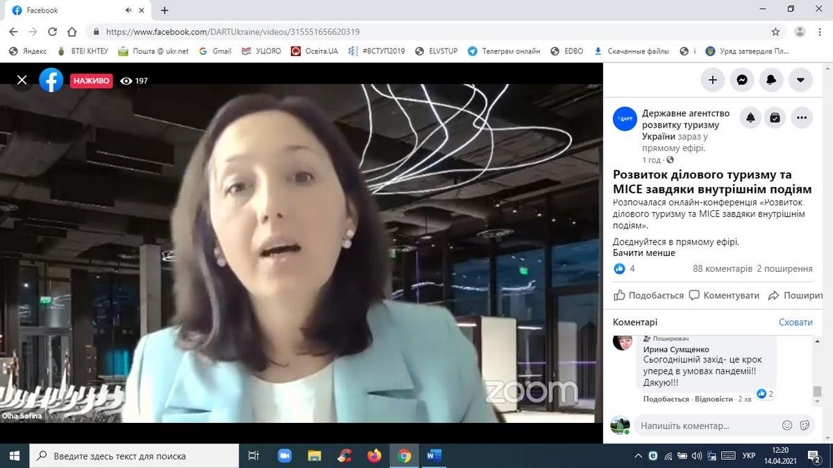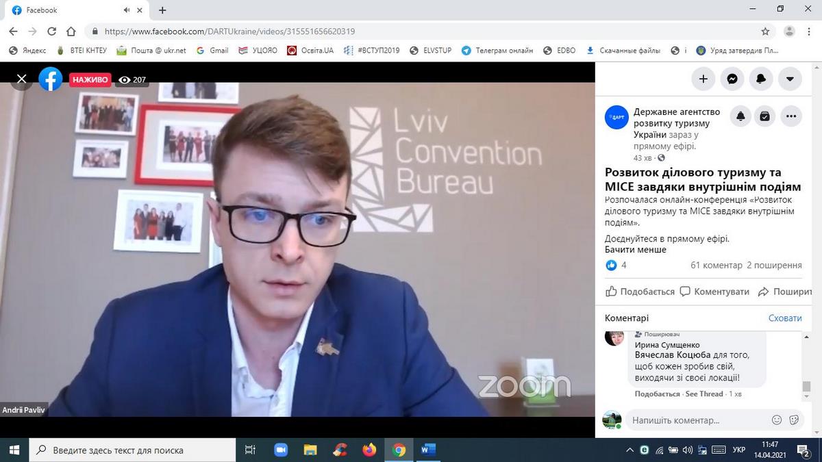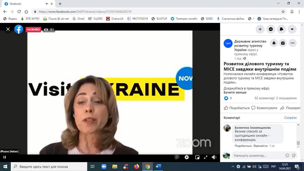14 квітня 2021 року науково-педагогічні працівники кафедри туризму та готельно-ресторанної справи, здобувачі вищої освіти за спеціальностями «Туризм», «Готельно-ресторанна справа» взяли участь в онлайн-конференції «Розвиток ділового туризму та МІСЕ завдяки внутрішнім подіям», організованій Державним агентством розвитку туризму України у межах реалізації Всеукраїнського проєкту «Tourism ReView».