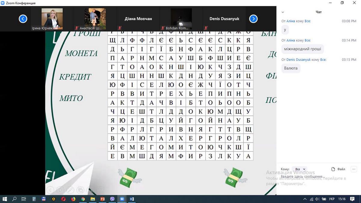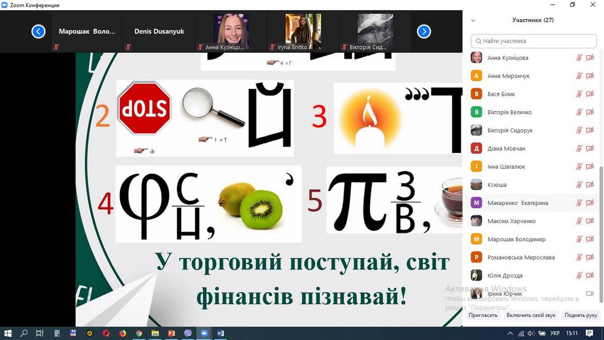Захід проводився на платформі Zoom, до нього долучилися майбутні абітурієнти та активні студенти старших курсів спеціальності 072 «Фінанси, банківська справа та страхування». Учасники дізналися багато цікавої інформації про гроші в ігровій формі, залучилися до вирішення кросвордів і ребусів. Онлайн-тренінг дозволив майбутнім абітурієнтам дізнатися про особливості навчання за спеціальністю 072 «Фінанси, банківська справа та страхування».