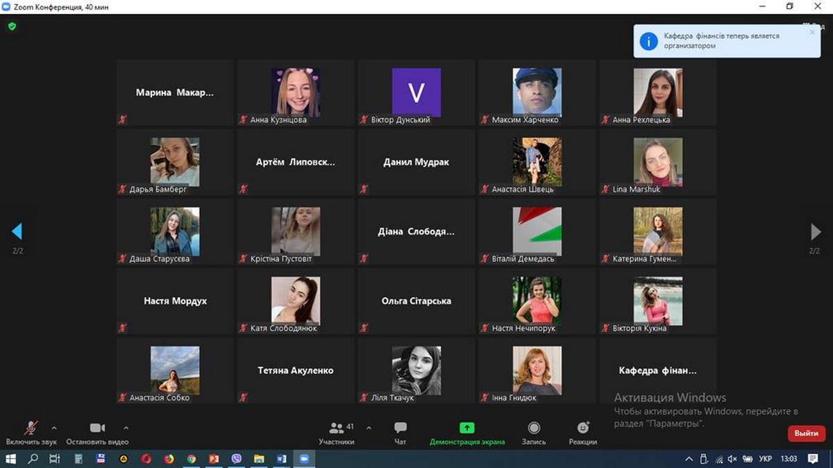 21 квітня 2021 року кафедрою фінансів організовано і проведено в режимі online на платформі Zoom секційне засідання «Фінансовий механізм забезпечення соціально-економічного розвитку країни» Х Всеукраїнської студентської науково-практичної конференції «Актуальні проблеми ефективного соціально-економічного розвитку України: пошук молодих». Засідання секції відкрила керівник секції к.е.н., доцент Оксана Демченко, з вітальним словом виступила завідувачка кафедри фінансів к.е.н., доцент Інна Гнидюк.