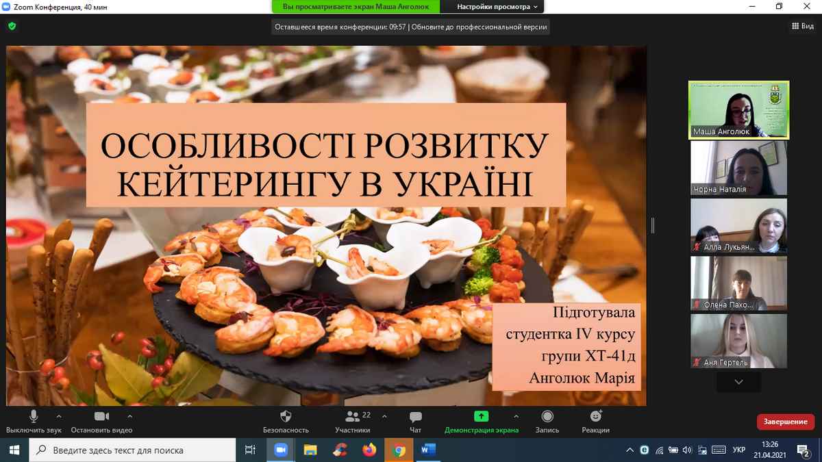 21 квітня 2021 року у рамках проведення Х Всеукраїнської студентської конференції «Актуальні проблеми ефективного соціально-економічного розвитку України: пошук молодих» відбулося засідання секції «Тенденції розвитку індустрії гостинності та харчової промисловості: регіональний та національний виміри». Участь у засіданні взяли здобувачі вищої освіти, які навчаються за спеціальностями «Туризм», «Готельно-ресторанна справа», «Харчові технології», науково-педагогічні працівники кафедри туризму та готельно-ресторанної справи.