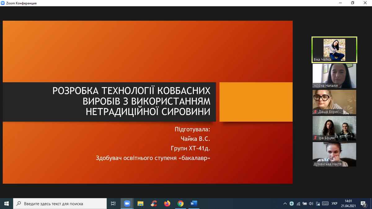 З науковими доповідями на актуальну тематику виступили Борисенко Д. (гр. Т-31д), Гертель А. (гр. Т-21д), Анголюк М. (гр. ХТ-41д), Цимбалюк К. (гр. ГРС-22д), Думанська Н. (гр. ХТ-31д), Чайка В. (гр. ХТ-41д). Виступи доповідачів прозвучали на актуальні та цікаві теми, свідченням чого стало жваве їх обговорення всіма учасниками зустрічі. Доповідачі були нагороджені подяками. Головувала на засіданні завідувач кафедри туризму та готельно-ресторанної справи, д.і.н., професор Чорна Н., секретар засідання – здобувач вищої освіти за спеціальністю 181 «Харчові технології» ОС «магістр», член студентського наукового товариства «ВАТРА» Таранюк І. Участь у засіданні взяли 25 осіб.