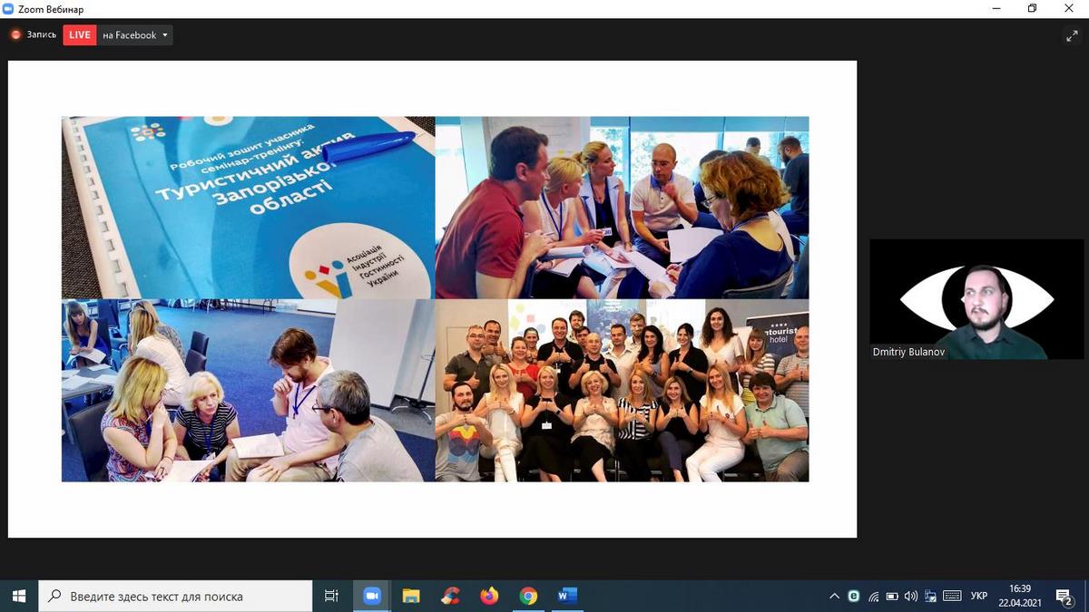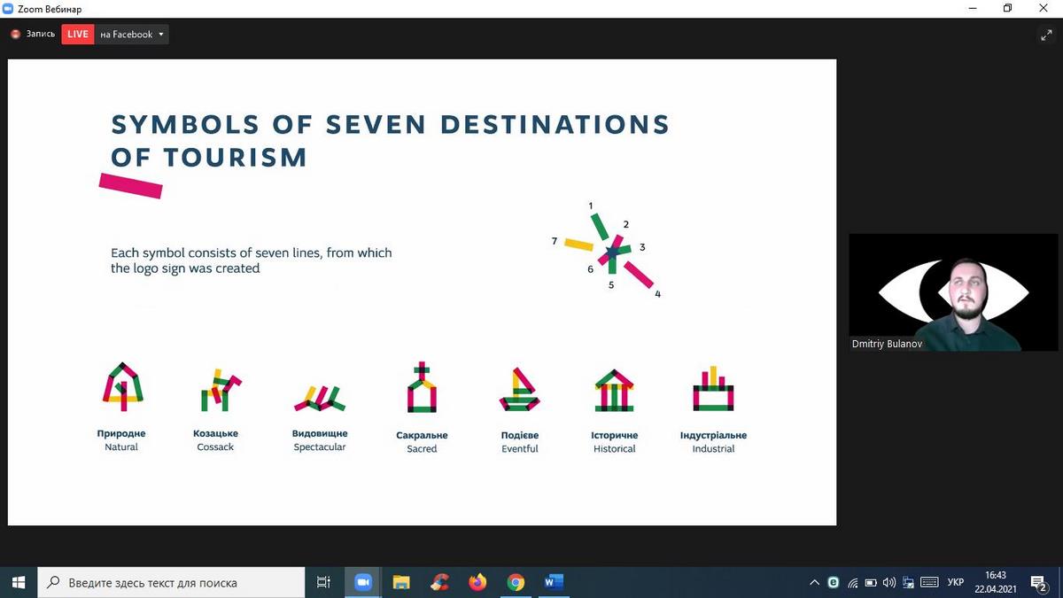 Для чого містам потрібен бренд та як він розробляється? Як створюється айдентика територій? Як працює айдентика як інструмент просування туристичних брендів? Відповідь на ці та багато інших запитань дав спікер вебінару Дмитро Буланов – креативний директор Bulanov Buro, арт-директор Zruchno travel, член Асоціації Індустрії Гостинності України, співавтор айдентик туристичного бренду України, автор проектів туристичного бренду міста Запоріжжя, Генічевська, Кам’янка-Бузького, Скадовськогго району, Черкащини, Приазов’я.