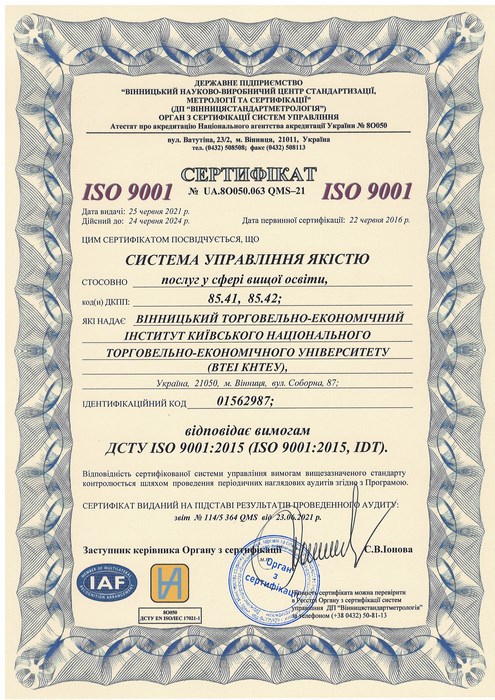 Вінницький торговельно-економічний інститут КНТЕУ отримав сертифікат на систему управління якістю, відповідну вимогам ДСТУ ISO 9001:2015 (ISO 9001:2015, IDT)