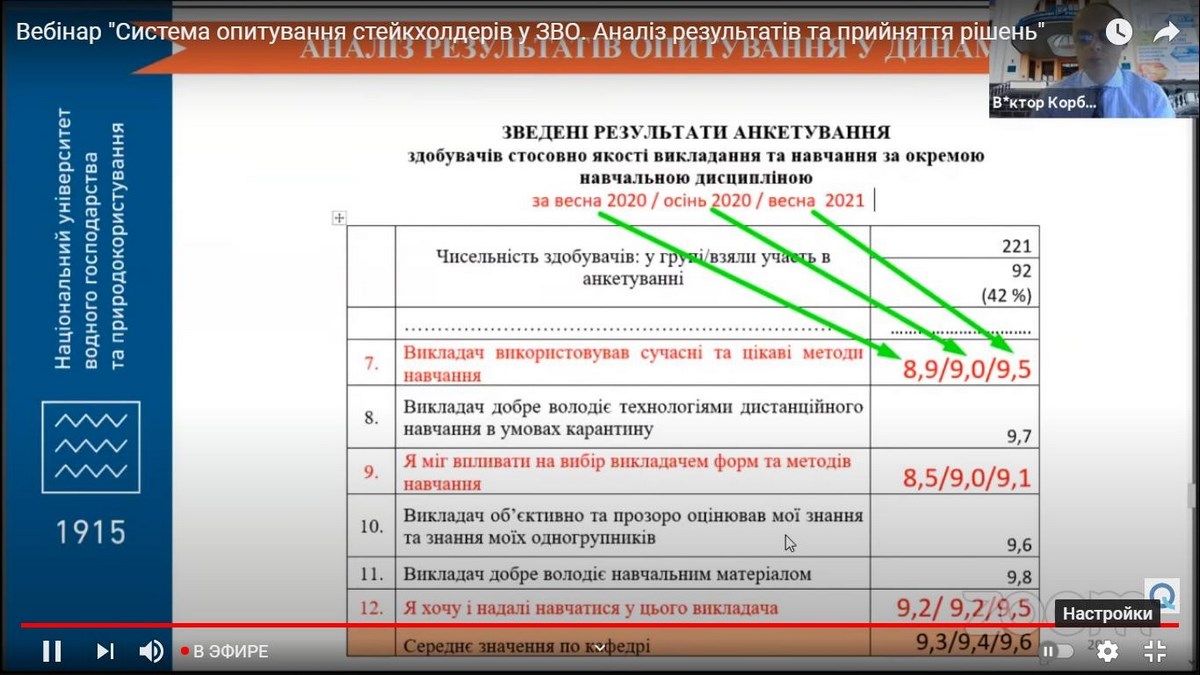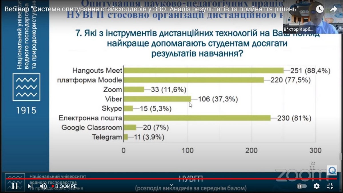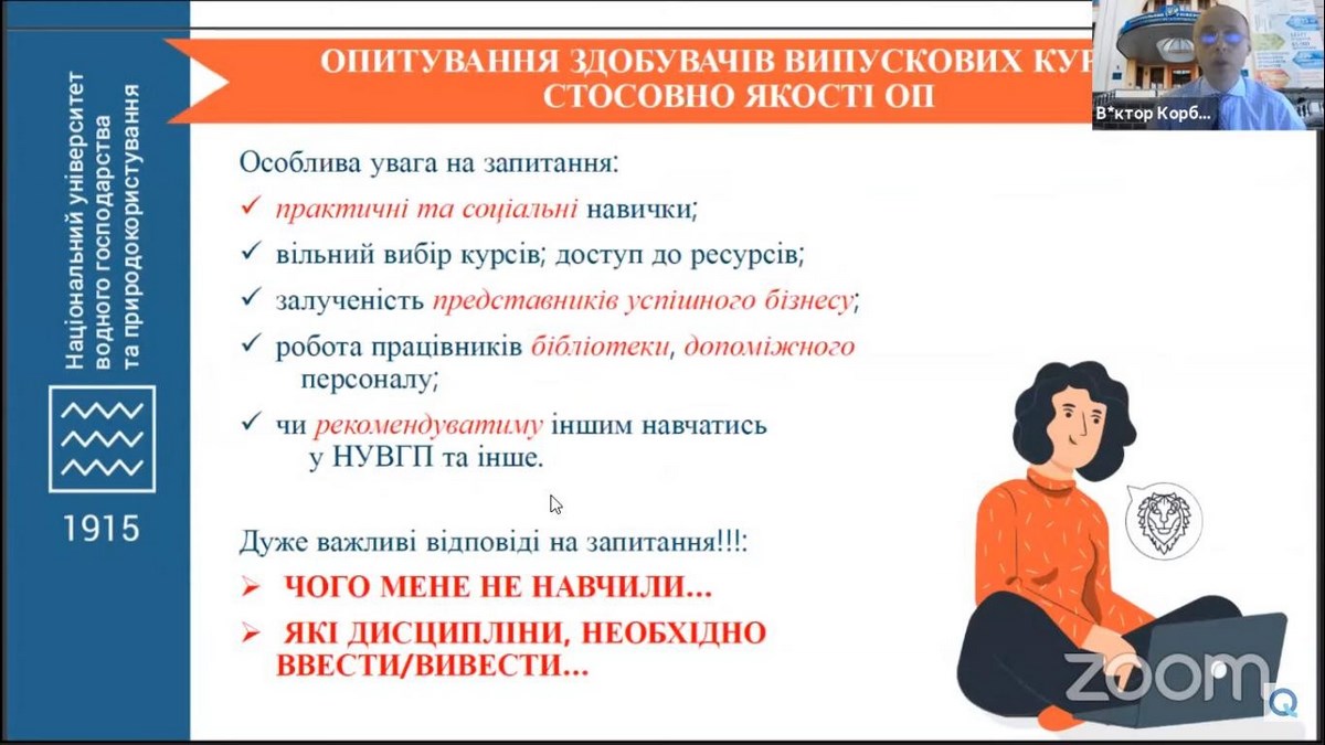 Спікер заходу – Віктор Корбутяк, доцент, кандидат технічних наук, начальник відділу якості освіти Національного університету водного господарства та природокористування (м. Рівне), експерт Національного агентства забезпечення якості вищої освіти запропонував на розгляд методи проведення опитування та визначив можливості для покращення системи анкетування у ЗВО.