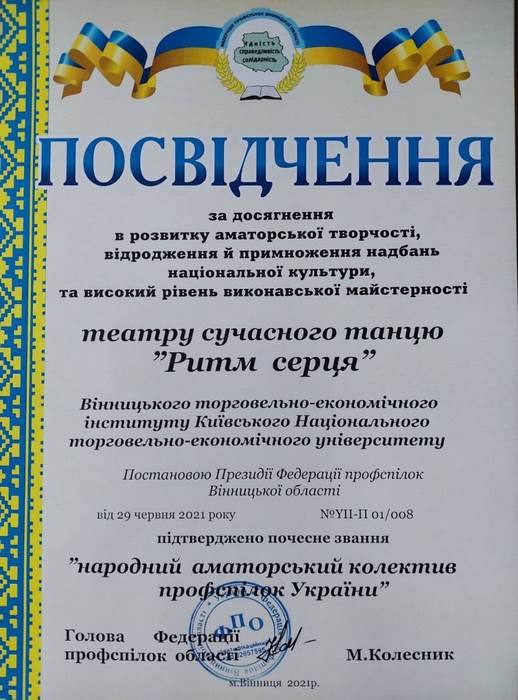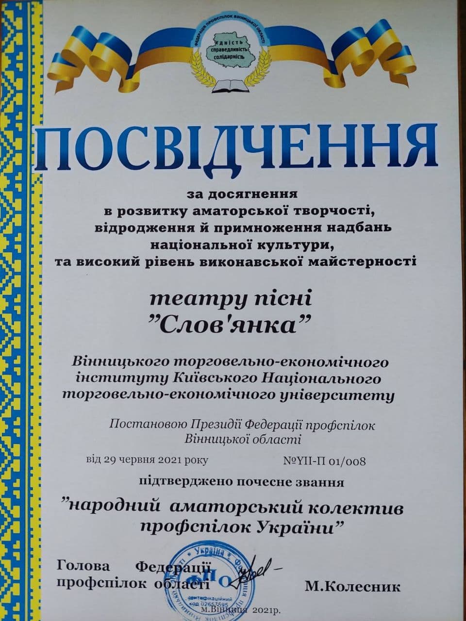 16 вересня 2021 року в Федерації профспілок області відбулося засідання Культурно - мистецької ради та Атестаційної комісії ФПО, на якому в дружній та теплій атмосфері урочисто вручили Свідоцтва Федерації профспілок області про підтвердження почесних звань «Народний - зразковий аматорський колектив профспілок України». На захід були запрошені начальник культурно - мистецького відділу Вікторія Гнатюк, керівники народних колективів - Адам Дзюба та Ілона Трохименко.