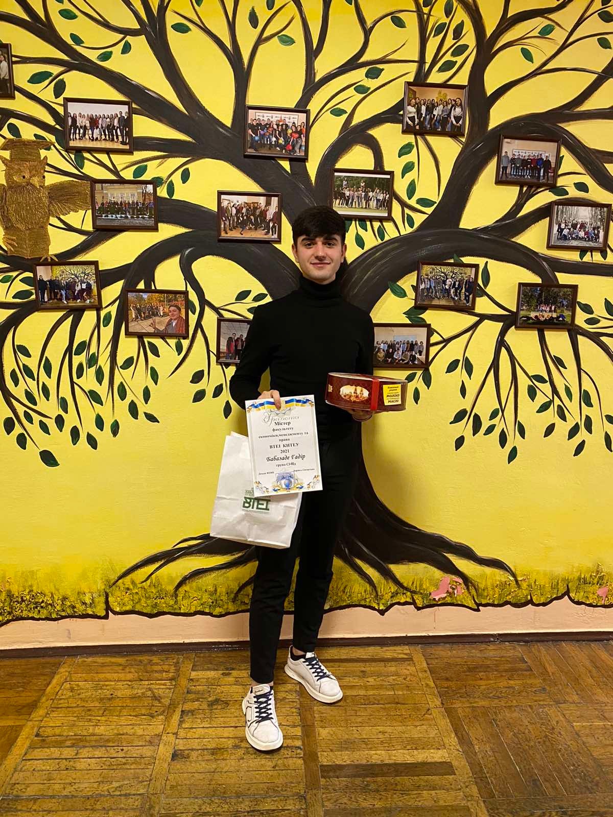 Містеру ФЕМП 2021 - Гадіру Бабазаде та Містеру Глядацьких симпатій - Іллі Швидкому вручені солодощі та подарунки з рекламною продукцією ВТЕІ КНТЕУ.