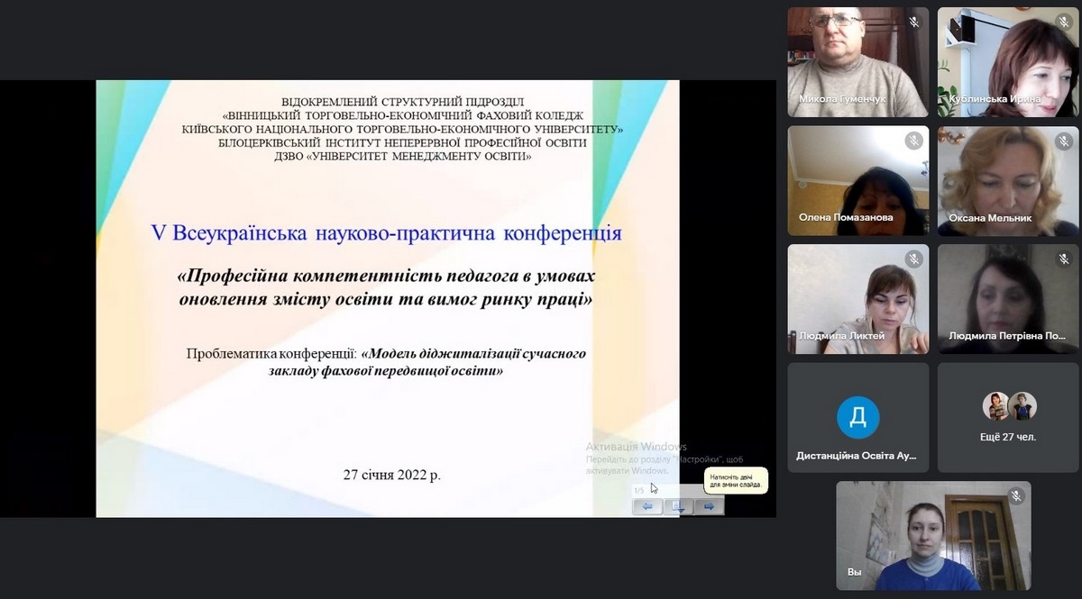 27 січня 2022 року викладачі кафедри економічної кібернетики та інформаційних систем Вінницького торговельно-економічного інституту КНТЕУ взяли участь у V Всеукраїнській науково-практичній конференції «Професійна компетентність педагога в умовах оновлення змісту освіти та вимог ринку праці», яка проходила на базі відокремленого структурного підрозділу «Вінницький торговельно-економічний фаховий коледж Київського національного торговельно-економічного університету» в онлайн-форматі.