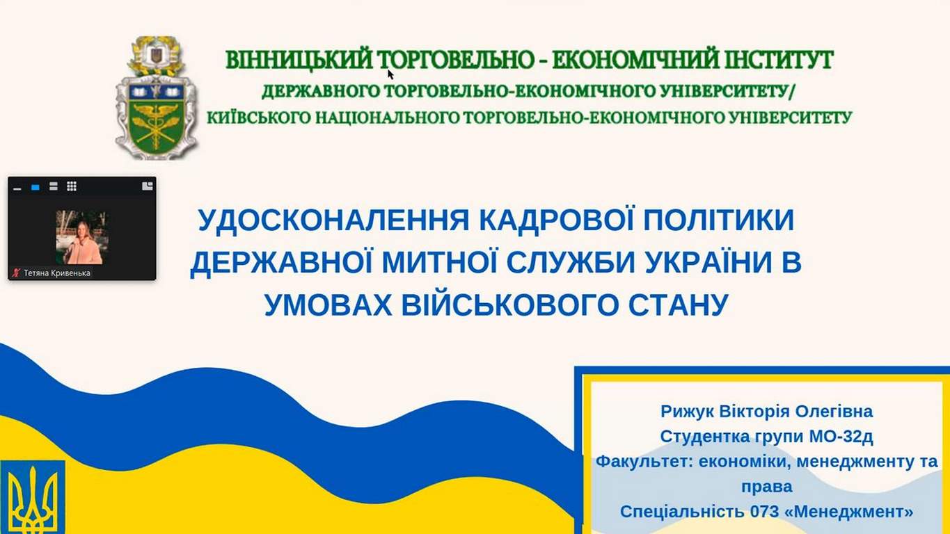 - Вікторія Рижук, студентка 3 курсу гр. МО-32д, спеціальності 073 «Менеджмент» з доповіддю на тему «Удосконалення кадрової політики Державної митної служби України в умовах воєнного стану» (науковий керівник – д.е.н., доцент Іван Заюков);