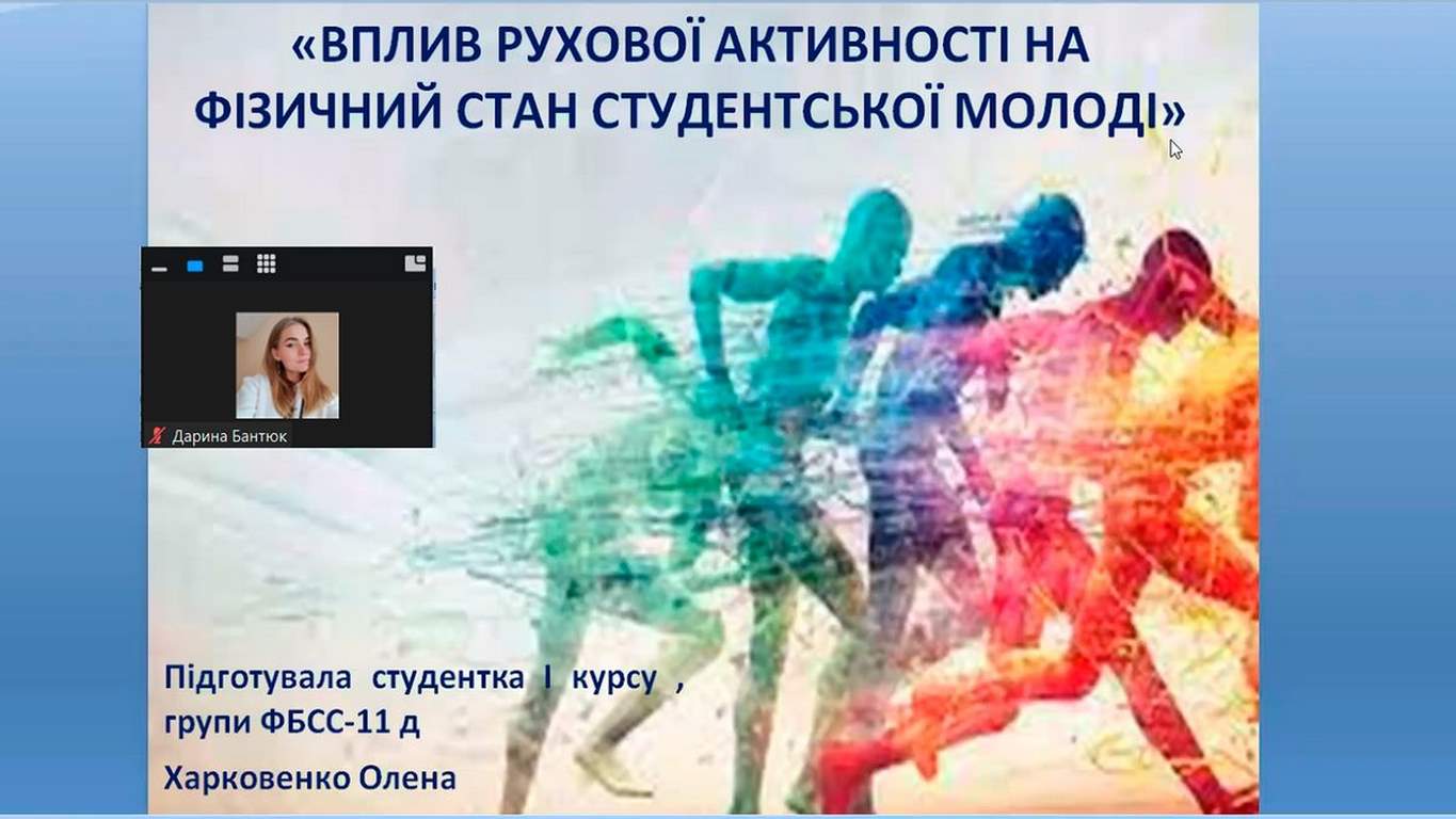 - Олена Харковенко, студентка 1 курсу гр. ФБСС-11д, спеціальності 072 «Фінанси, банківська справа та страхування» з доповіддю на тему «Рухова активність як чинник до здорового способу життя студентської молоді» (науковий керівник – асистент Ірина Рогаль).