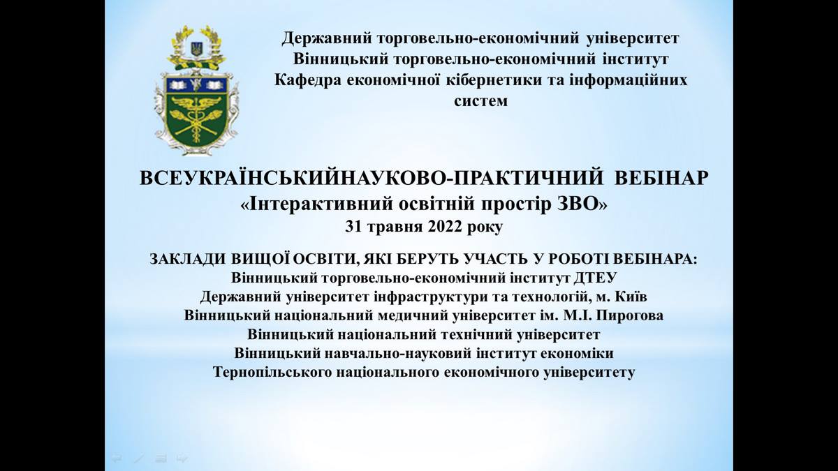 31 травня 2022 року на факультеті економіки, менеджменту та права відбувся всеукраїнський науково-практичний вебінар «Інтерактивний освітній простір ЗВО» в режимі online на платформі ZOOM. Захід проводився кафедрою економічної кібернетики та інформаційних систем спільно з кафедрою менеджменту та адміністрування. У роботі вебінару взяли участь: Державний університет інфраструктури та технологій, Вінницький національний медичний університет ім. М.І. Пирогова, Вінницький національний технічний університет, Вінницький навчально-науковий інститут економіки Західноукраїнського національного університету. До уваги учасників вебінару було запропоновано цікаві презентації доповідачів, далі відбулося активне обговорення доповідей, обмін корисним досвідом з організації інтерактивного освітнього простору, навчальних процесів та науково-дослідної роботи у ЗВО.