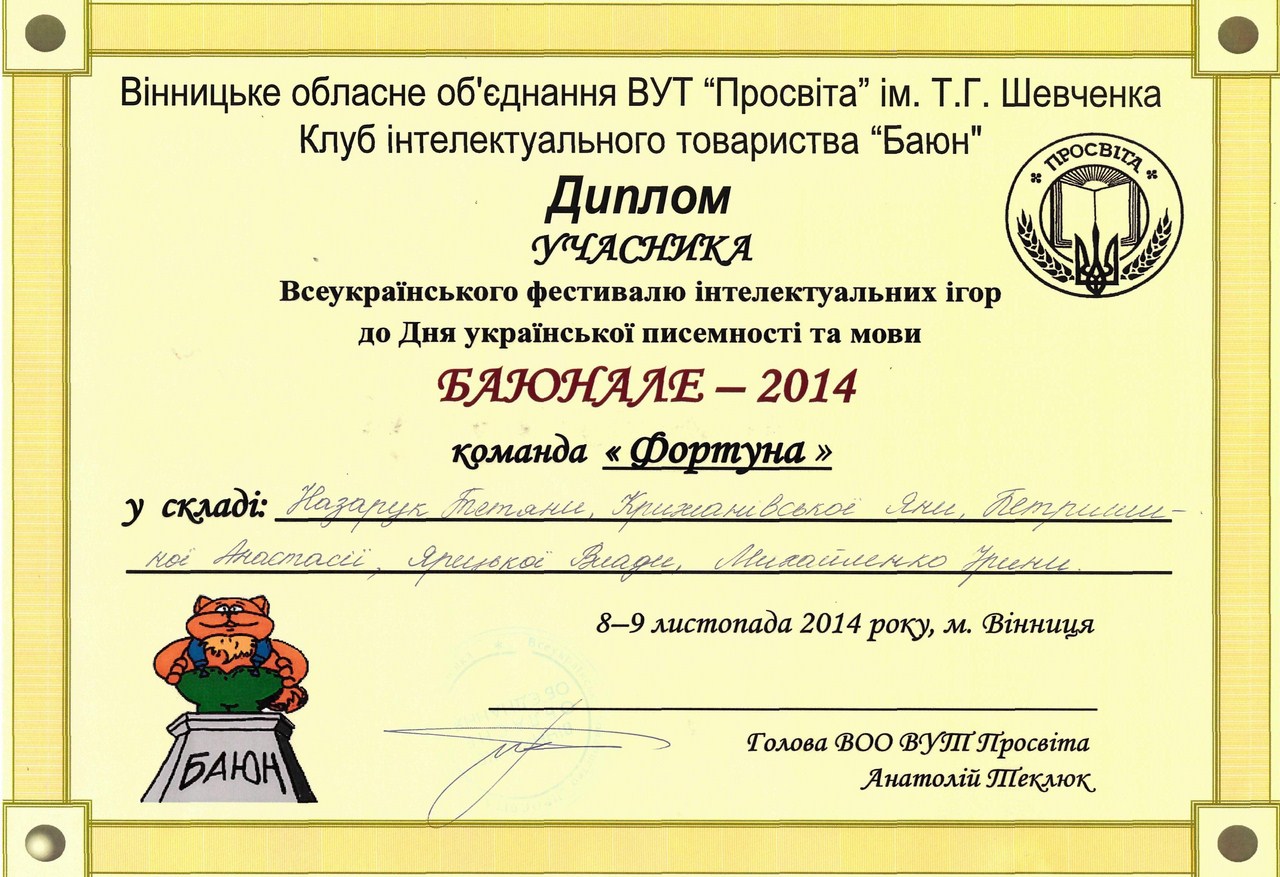 8-9 листопада 2014 року на базі ВНТУ відбувся фестиваль інтелектуально-спортивних ігор «Баюнале» за підтримки Вінницької обласної Федерації інтелектуально-спортивних ігор, в якому взяли участь понад 40 команд з різних міст України. Наш інститут представляла команда «Фортуна» у складі якої були студенти: Назарук Тетяна (МЕ-31) – капітан команди, Петришина Анастасія (МЕ-31), Михайленко Ірина (ДФК-41), Ярецька Влада (Т-11), Крижанівська Яна (ГРС-11). За студентським рейтингом фестивалю наші мужні дівчата вибороли почесне 3 місце серед 14 студентських команд з різних регіонів України. Команда «Фортуна» нагороджена Дипломом та кубком переможців «Граніт науки ІІІ ступеня»