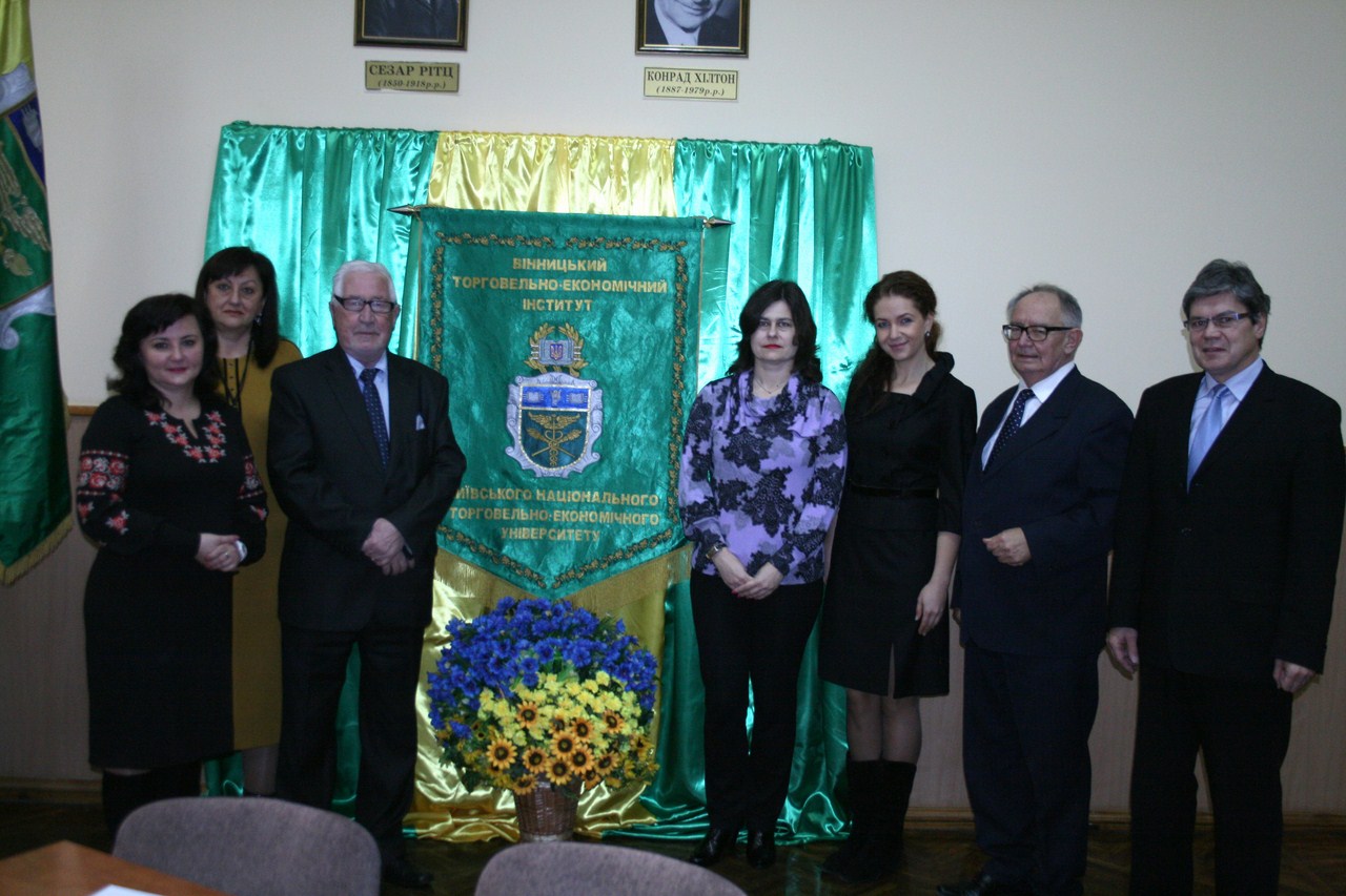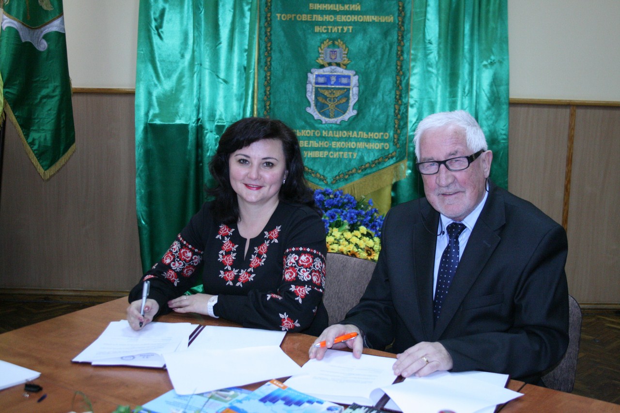 11 листопада у ВТЕІ КНТЕУ відбулась зустріч з представниками Вищої школи соціально-економічних наук на чолі з проректором професором Джерзі Бабіаком. В рамках зустрічі обговорювались питання визначення умов співробітництва щодо здійснення двостороннього обміну студентами та реалізації Програми подвійних дипломів між ВТЕІ КНТЕУ та ВШСЕН. За умов участі в програмі подвійних дипломів студенти будуть паралельно зараховані на комбіновану (дистанційну та очну) форми навчання. Відбулася офіційна церемонія підписання Угоди про співпрацю між ВТЕІ КНТЕУ та ВШСЕН. Після чого відбулася широка дискусія на тему розвитку вищої освіти і науки у Польщі та в Україні, були обговорені перспективи співробітництва, а також інші актуальні питання.