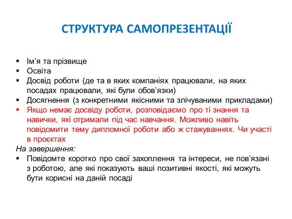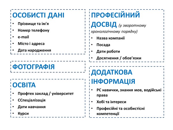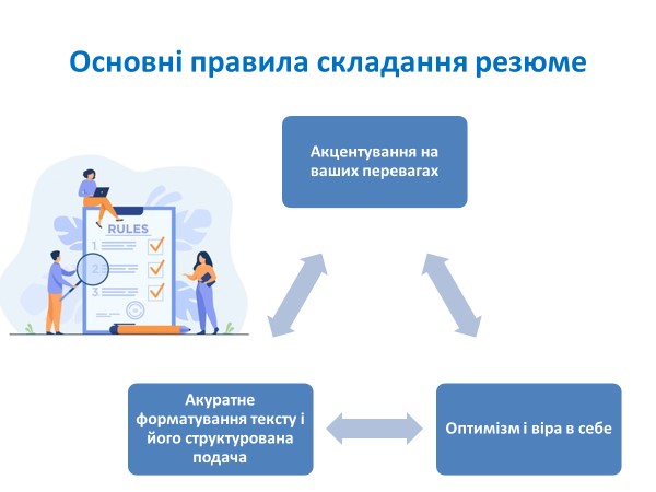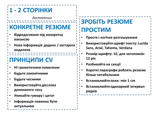 • одного резюме недостатньо для ефективного працевлаштування, важливо для кожної бажаної вакансії готувати відповідне резюме, яке буде включати інформацію про вартість працівника для компанії та дозволить HR-директору швидко прийняти рішення про прийняття на роботу працівника.