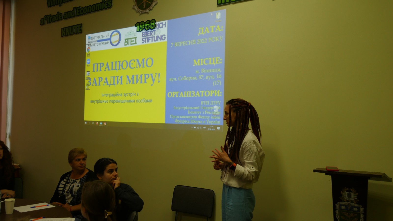 7 вересня 2022 року відбулася інтеграційна зустріч для внутрішньо переміщених осіб «ПРАЦЮЄМО ЗАРАДИ МИРУ!», організаторами якої стали Вінницький торговельно-економічний інститут ДТЕУ, Індустріальний Гендерний Комітет з Реклами в партнерстві з Представництвом Фонду імені Фрідріха Еберта в Україні.