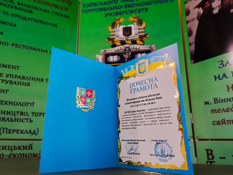29 вересня 2022 року заступника директора з навчально-виховної роботи Вінницького торговельно-економічного інституту ДТЕУ Ірину Юрчик було нагороджено почесною грамотою Вінницької обласної військової адміністрації та обласної Ради з нагоди Дня працівників освіти. Людям, які обрали цю професію, притаманна дивовижна риса - вони ніколи не знають втоми, ніколи не скаржаться, не дорікають, присвячуючи кожну вільну хвилину збагаченню освітнього потенціалу нації. Вітаємо Ірину Юрчик з почесною нагородою та бажаємо успіхів, наснаги та натхнення у подальшій праці!