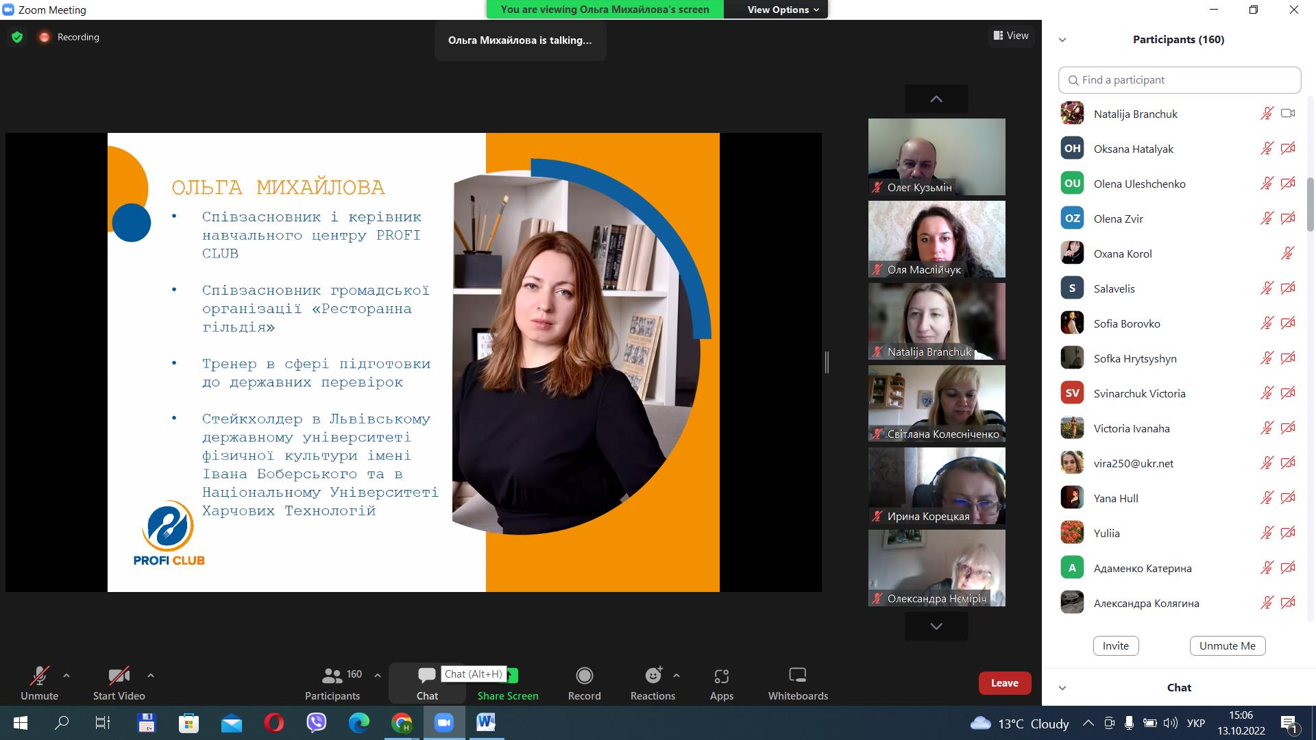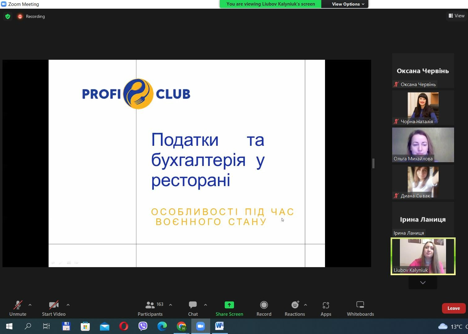 13 жовтня 2022 року науково-педагогічні працівники кафедри туризму та готельно-ресторанної справи та здобувачі вищої освіти за спеціальністю «Готельно-ресторанна справа» долучилися до онлайн-зустрічі «Ресторанний бізнес в умовах війни», організованої навчальним центром «PROFI CLUB».