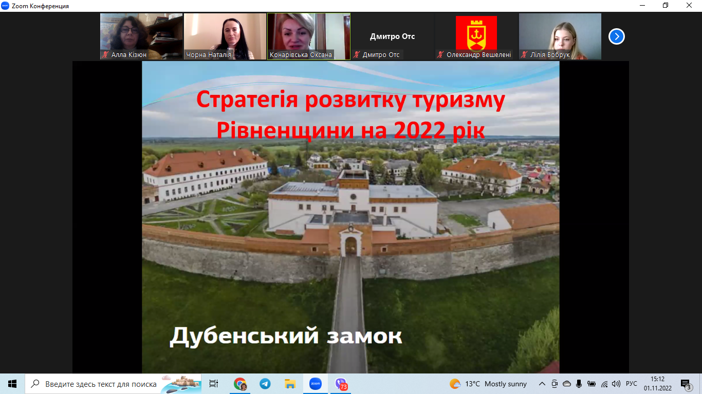- Оксана Конарівська, доцент кафедри туризму та готельно-ресторанної справи Національного університету водного господарства та природокористування, канд. екон. наук, доцент, з доповіддю на тему: «Спеціальні умови функціонування внутрішнього туризму на Рівненщині під час воєнного стану»;