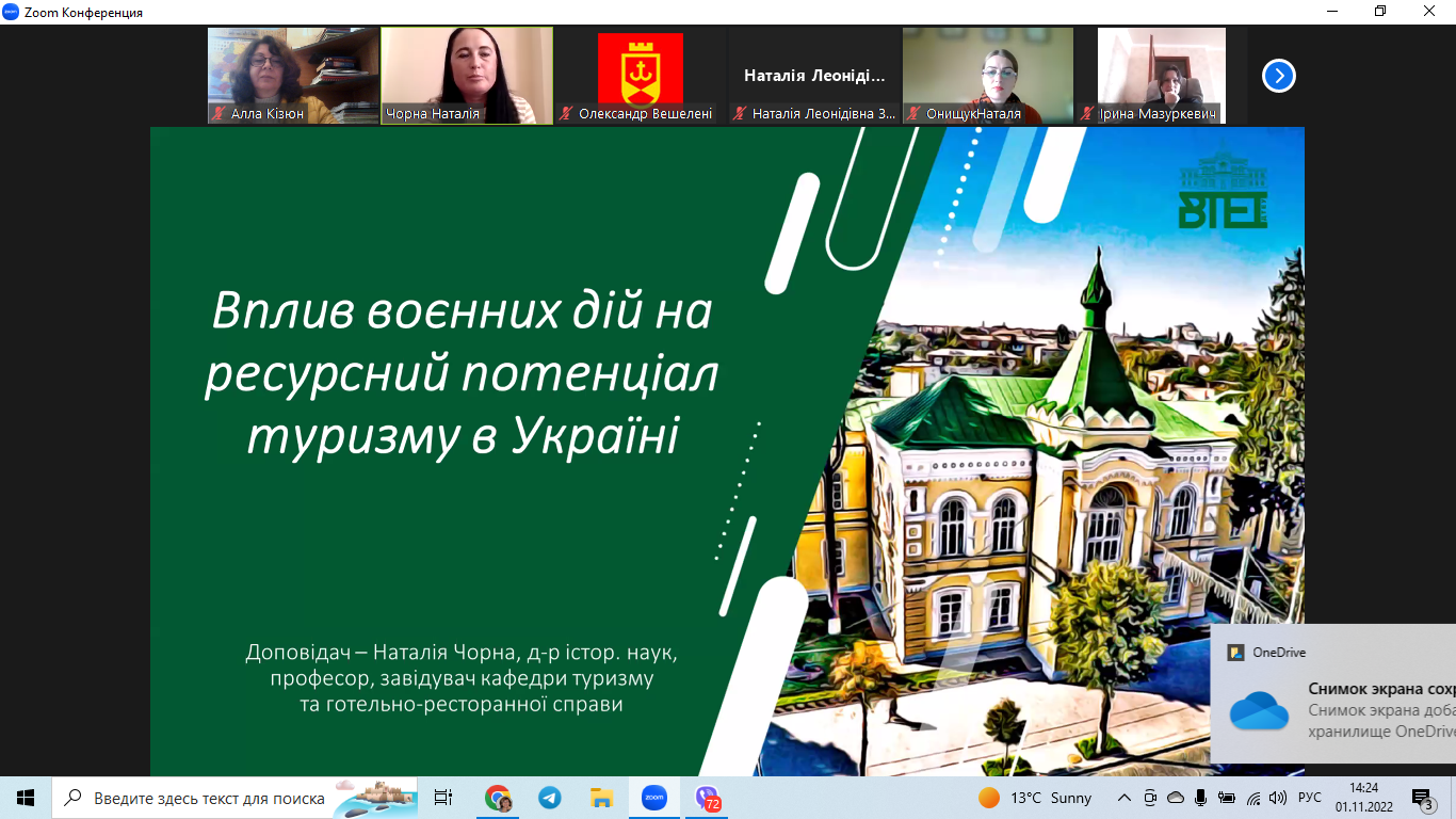 - Наталія Чорна, завідувач кафедри туризму та готельно-ресторанної справи Вінницького державного торговельно-економічного інституту ДТЕУ, д-р істор. наук, професор, з доповіддю на тему: «Вплив воєнних дій на ресурсний потенціал туризму в Україні»;