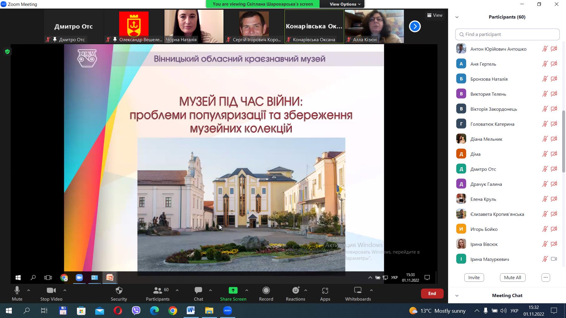 - Світлана Шароварська, заступник директора з наукової роботи Вінницького обласного краєзнавчого музею, з доповіддю на тему: «Проблеми популяризації та збереження музейних колекцій під час війни»;