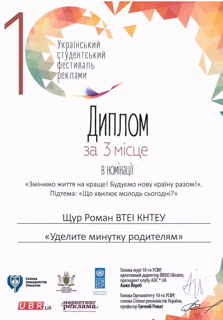 нагородження учасників фестивалю Євген Вікторович Ромат відзначив: «Переможці цьогорічного фестивалю – справжні професіонали, які вже зараз можуть претендувати на робочі місця у провідних рекламних агентствах». Команда ВТЕІ КНТЕУ отримала три нагороди: Диплом за 2 місце у номінації «Змінимо життя на краще! Будуємо нову країну разом» Підтема: «Що хвилює молодь сьогодні?» - Каневський Д., Красноштан В., Лукиянчтн В. гр.МР-11с робота: «Ролік на підтримку військових». Диплом за 3 місце у номінації «Змінимо життя на краще! Будуємо нову країну разом» Підтема: «Що хвилює молодь сьогодні?» - Щур Роман гр.МР-11м робота: «Уделите минутку родителям». Диплом за 3 місце у номінації ВІДЕОРЕКЛАМА - Юркова Н., Коваль В., Павленко М., Пасічник Т. гр.МР31 робота «Зміни своє життя на краще!».