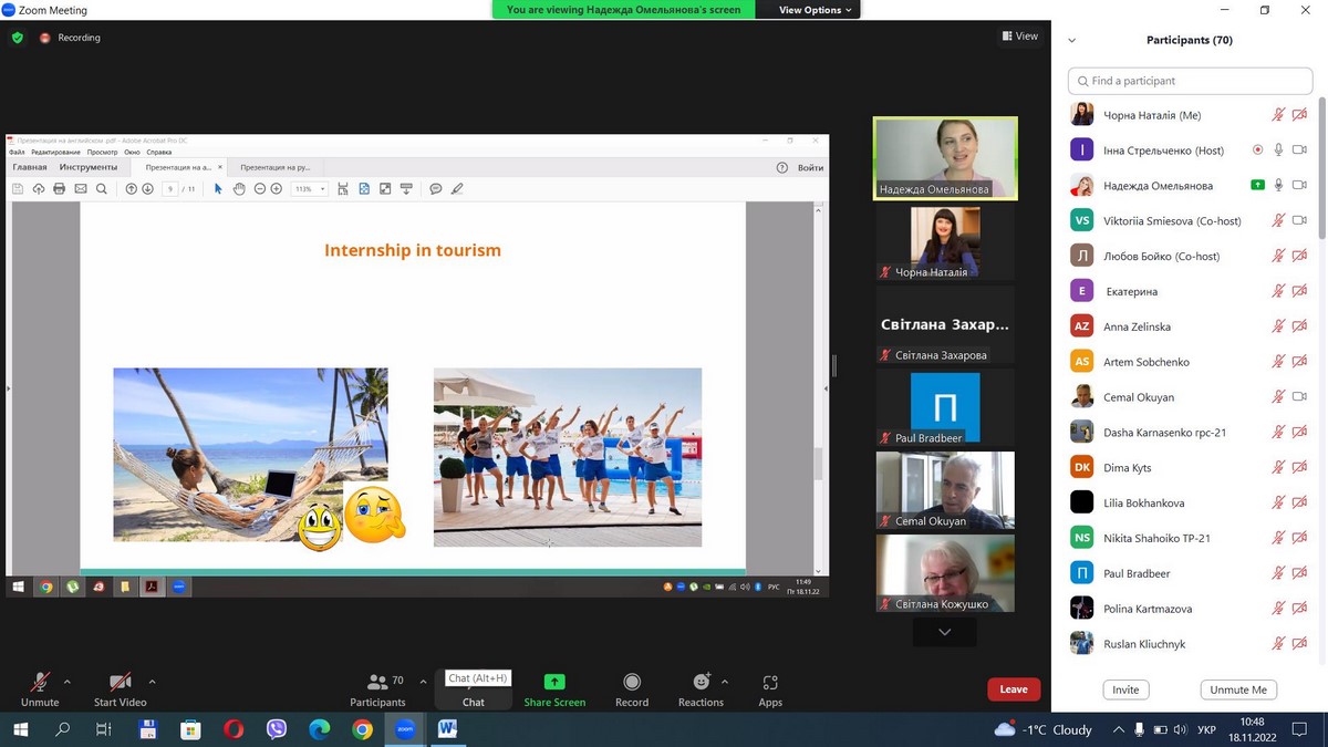 18 листопада 2022 року науково-педагогічні працівники кафедри туризму та готельно-ресторанної справи, здобувачі вищої освіти за спеціальностями 241 «Готельно-ресторанна справа», 242 «Туризм» взяли участь у ІІ Міжнародній конференції «Розвиток туристичної галузі та індустрії гостинності: проблеми, перспективи, конкурентоздатність», організованій Університетом імені Альфреда Нобеля (м. Дніпро).