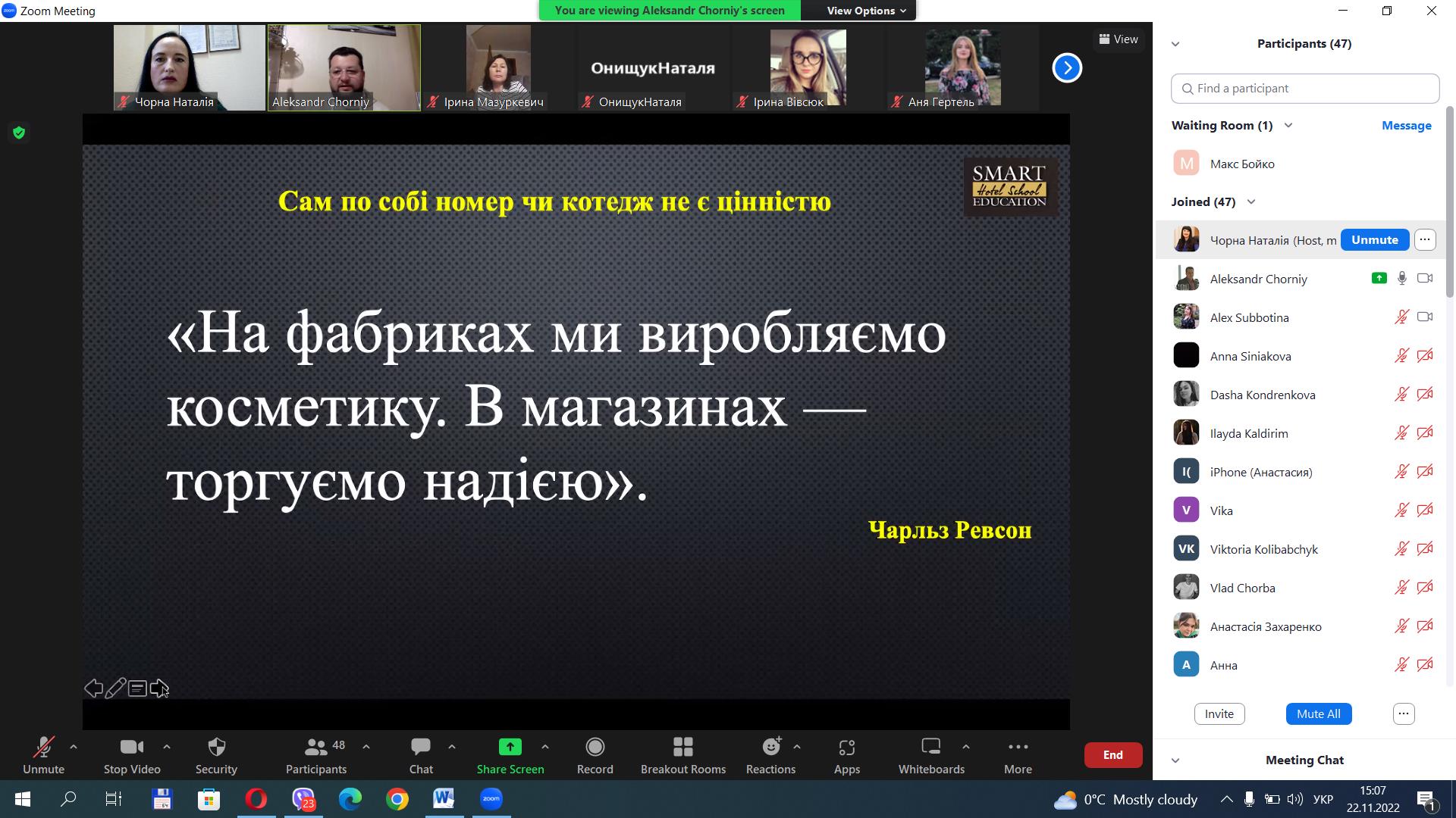 Проведений у рамках вивчення навчальних дисциплін «Готельна справа», «Управління бізнес-процесами в готельно-ресторанному бізнесі», «Поведінка споживачі послуг гостинності», семінар був корисним для здобувачів вищої освіти, і колектив кафедри туризму та готельно-ресторанної справи вдячний Олександру Чорному за його проведення.